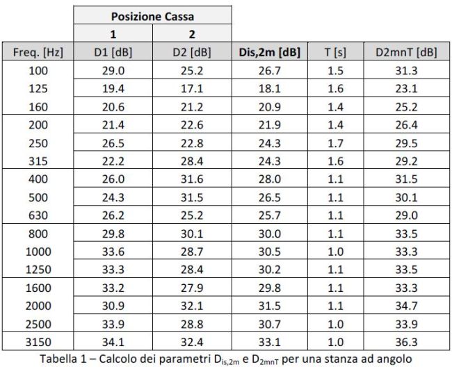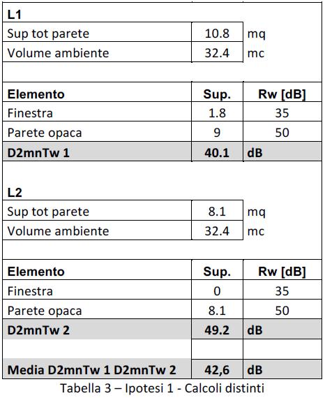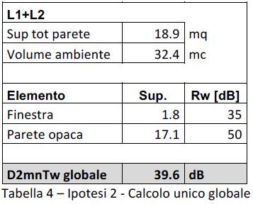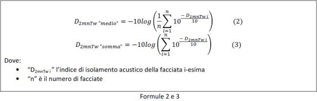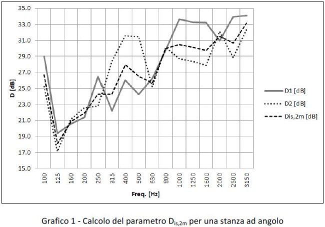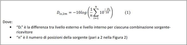 Come determinare l’isolamento di facciata di un ambiente caratterizzato da più esposizioni, come ad esempio una stanza posto nell’angolo di un edificio L’isolamento acustico di una facciata rispetto ai rumori che arrivano dall’esterno può essere calcolato analiticamente con le relazioni matematiche della norma EN ISO 12354-3 e misurato in opera seguendo le indicazioni della norma UNI EN ISO 16283-3. Il primo documento spiega i modelli di calcolo da utilizzare e le modalità di acquisizione e inserimento dei dati. La 16283-3 invece definisce quali sono gli strumenti per effettuare le misure, le tecniche di rilievo e i metodi per l’analisi dei dati acquisiti. Anche se le norme citate sono relativamente recenti (2016 e 2017), le procedure descritte al loro interno sono ben note tra gli addetti ai lavori. Infatti i nuovi documenti ripropongono, senza sostanziali modifiche, i contenuti delle precedenti UNI EN 12354-3, datata 2002, e UNI EN ISO 140-5, pubblicata nel 2000. Per i calcoli previsionali si segnala che in Italia è stato pubblicato nel 2005 anche il rapporto tecnico UNI TR 11175 che adatta le relazioni matematiche della UNI EN 12354-3 al contesto nazionale. Tale documento nei prossimi mesi verrà revisionato in funzione della nuova EN ISO 12354-3. A prescindere da quale norma si stia considerando, un problema che può presentarsi ai professionisti del settore è la determinazione dell’isolamento di facciata di un ambiente caratterizzato da più esposizioni, come ad esempio una stanza posto nell’angolo di un edificio. Il presente articolo propone alcune considerazioni in merito. Esempio di ambiente con facciata “ad angolo” Considerazioni di partenza Partiamo da alcune considerazioni: • Il requisito di isolamento dai rumori esterni è definito in Italia dal descrittore “indice di isolamento acustico di facciata normalizzato rispetto al tempo di riverberazione (D2m,nT,w)”. Tale descrittore indica, in estrema sintesi, quanti “dB” la facciata riesce ad abbattere. Pertanto valori più alti individuano prestazioni migliori. • Il DPCM 5-12-1997 “Determinazione dei requisiti acustici passivi degli edifici” specifica i limiti di legge da rispettare in opera, a edificio finito, per varie destinazioni d’uso. • I limiti riguardano ogni stanza dell’unità immobiliare e sono indipendenti dal “clima acustico” esterno alla facciata. Ad esempio ogni ambiente abitativo di una residenza deve essere caratterizzato da una prestazione D2m,nT,w superiore o uguale a 40 dB. Indipendentemente che la facciata sia rivolta verso una strada trafficata o verso un’area silenziosa. • Il descrittore D2m,nT,w è una caratteristica dell’intera facciata della stanza, non dei singoli elementi che la compongono. Si intende quindi che il limite di 40 dB per le residenze non è riferito ai soli serramenti o alle sole pareti opache. Dipende invece dalla combinazione di tutti gli elementi che costituiscono la partizione. • Il parametro D2m,nT,w dipende anche dal volume dell’ambiente in esame. A “parità di facciata” ambienti più grandi sono caratterizzati da valori di isolamento più elevati. • Per le stanze con più esposizioni la prestazione di isolamento è determinata dalla combinazione delle prestazioni di tutte le facciate dell’ambiente. Anche se solo una di queste è rivolta verso una sorgente di rumore. Questo aspetto è stato chiaramente specificato nelle norme relative alle misure in opera (UNI EN ISO 16283-3 e precedente UNI EN ISO 140-5). La misura in opera per le facciate “ad angolo” In estrema sintesi la UNI EN ISO 16283-3 indica che per misurare in opera l’isolamento di una facciata occorre posizionare all’esterno dell’edificio una sorgente sonora e rilevare il livello di rumore esterno, a 2 metri dalla parete, e all’interno nella stanza in esame. Dalla differenza delle misure si ricava il parametro isolamento acustico (D) che viene poi normalizzato con il tempo di riverbero dell’ambiente (D2mnT). L’altoparlante viene posizionato ad almeno 7 metri dalla facciata con un’inclinazione di 45° e deve determinare sull’intero provino un livello di pressione sonora omogeneo. La norma al paragrafo 9.6.2 specifica che se la stanza ha più di un muro esterno “in genere non è possibile effettuare le misurazioni con una sola posizione della sorgente”. Pertanto si procede realizzando misure distinte utilizzando diverse posizioni dell’altoparlante, una per ogni facciata dell’ambiente. Posizioni della sorgente esterna per una facciata “ad angolo” Al paragrafo 9.6.3 si legge che l’isolamento acustico “complessivo” dell’ambiente si determina mediando le rilevazioni con una specifica relazione matematica (Formula 1) In sostanza si tratta di eseguire una “media logaritmica” dei valori di isolamento (Di) alle singole frequenze. Tali dati vengono poi “corretti” con il tempo di riverbero (T) della stanza per determinare i sedici valori in frequenza di isolamento acustico normalizzato (D2mnT). La Tabella 1 e il Grafico 1 mostrano i risultati di un esempio di calcolo di un caso reale. Come era logico aspettarsi, si osserva che i valori Dis,2m sono intermedi tra D1 e D22. Utilizzando la procedura della norma UNI EN ISO 717-1, si passa dai sedici valori in frequenza (D2mnT), al “valore singolo” indice di valutazione (D2mnTw), da confrontare con i limiti del DPCM 5-12-1997. I dati dell’ultima colonna della Tabella 1 determinano una prestazione D2mnTw pari a 33 dB. Si evidenzia che se invece si eseguono due calcoli distinti con i dati delle colonne D1 e D2, normalizzati con il tempo di riverbero della stanza, si ottengono i valori D2mnTw1= 34 dB e D2mnTw 2= 33 dB. Il calcolo previsionale per le facciate “ad angolo” La EN ISO 12354-3 descrive le relazioni matematiche per determinare in via previsionale l’isolamento di facciata. In sostanza conoscendo le prestazioni fonoisolanti (Rw) degli elementi che compongono la 