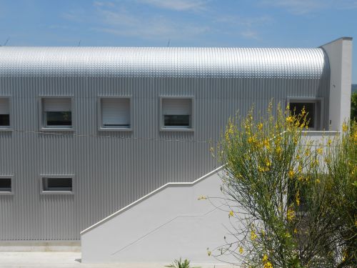 San Giovanni Lipioni (CH) è un borgo che si arrampica su una collina a sovrastare la valle del Trigno, all’estremità sud dell’Abruzzo: è uno dei tantissimi piccoli paesi che punteggiano il cuore appenninico della penisola italiana. E’ un paesaggio di case strette le une alle altre, tetti di coppi, facciate chiare, pietra. Qui sorge il nuovo edificio polifunzionale di proprietà comunale di cui l’architetto Andrea Rossi, di San Giovanni Lipioni, ha eseguito la progettazione: un edificio dall’aspetto moderno, funzionale, che rompe con la tipica architettura dei luoghi, ma con la quale dialoga e si inserisce con garbo. E’ un edificio di tre piani suddiviso in un piano parzialmente interrato adibito a rimessa, una sala polifunzionale al piano terra, una zona espositiva al primo piano; pianta dal profilo curvilineo per complessivi 650 mq, tetto piano: sono l’articolazione dei volumi, gli aggetti, la posizione delle aperture, la grande scala esterna che gli conferiscono stile e carattere. In particolare è la facciata ovest, quella che si rivolge al cuore del borgo, alla piazza principale distante poche decine di metri, che si distingue per la forza del linguaggio architettonico. Il suo fronte, caratterizzato da una successione di aperture quadrate, viene movimentato sul lato di sinistra da volumi bianchi in aggetto che rielaborano in chiave contemporanea le numerose superfetazioni presenti negli edifici storici, su quello di destra da una lunga scala che lo taglia diagonalmente; questa soluzione viene poi evidenziata dalla scelta delle finiture, che sottolineando vuoti e pieni, la vanno a caratterizzare fortemente.E la scelta vincente è senz’altro l’uso delle lastre d’alluminio per il rivestimento della parte centrale della facciata, più arretrata, dalla quale emergono bianchi i volumi in aggetto. Queste lastre inoltre – tek28 prodotte da Alubel – non solo rivestono la facciata ma si incurvano per diventare anche rivestimento della copertura, scelta che valorizza ulteriormente la scansione dei volumi architettonici. Ovviamente una soluzione di questo tipo è resa possibile dall’estrema versatilità delle lastre Alubel, che possono indifferentemente venire utilizzate per le facciate e per le coperture e che possono essere curvate mediante tacchettatura o calandratura.In questo caso sono state scelte lastre grecate tek28 in alluminio 7/10 preverniciato color silver RAL 9006, coibentate con poliuretano espanso da 10mm, che sono state fissate alla sottostante sottostruttura in profilati di acciaio zincato e sono state curvate mediante tacchettatura. I punti di forza di un rivestimento in lamiera metallica sono molteplici e ormai apprezzati da un numero sempre maggiore di progettisti: l’estrema durabilità, la protezione dall’acqua e dal rumore, la versatilità e la facilità di messa in opera li rendono estremamente competitivi rispetto a soluzioni più tradizionali. In questo cantiere per esempio tutte le opere di lattoneria, consistenti nella posa della sottostruttura, dei sottomanti e degli isolanti, la posa delle lastre, le rifiniture e lo scossalinaggio sono state completate dall’impresa Metal Barile di Macchiagodena (IS) in soli dodici giorni di lavoro e con costi contenuti. Scarica i particolari tecnici in PDF PART COSTRUTTIVO 1 PART COSTRUTTIVO 2 piano terra piano primo prospetto est prospetto ovest sezioni Consiglia questo progetto ai tuoi amici Commenta questo progetto