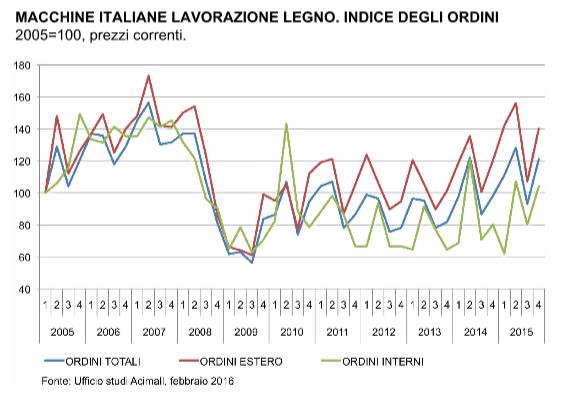 Non chiude con numeri eclatanti, il 2015, per le tecnologie italiane per la lavorazione del legno, ma la tendenza dell’ultimo trimestre dello scorso anno rende ottimisti, nonostante la maggior parte degli ordini pervenuti alla fine dell’anno si rifletteranno sul fatturato di questo 2016. In generale, l’indagine congiunturale effettuata dall’Ufficio studi Acimall su un campione di aziende, mostra una crescita del 23,3% rispetto allo stesso periodo 2014. Molto buoni i risultati del mercato italiano che registra quasi un 30% in più, mentre per l’estero si ferma ad un +17%. Dato positivo non solo a livello di tendenza, ma anche dal punto di vista congiunturale, visto che si parla di una crescita rispetto al trimestre precedente (ovvero al periodo luglio-settembre 2015) del 30 per cento, il 7 per cento destagionalizzato, dunque tenendo conto dei giorni lavorativi. Un dato importante, perchè – di fatto – segna il definitivo consolidamento del trend di crescita che perdura dai primi mesi del 2014 (vedi grafico allegato). Preconsuntivi 2015 ACIMALL Si parla di 2,8 mesi di produzione assicurata (mentre nel 2014 erano 2,5), con una variazione dei prezzi dal primo gennaio dell’uno per cento (1,3 per cento nel 2014). Quasi la metà degli intervistati si è pronunciato positivamente sulla qualità della produzione, il 47% è stabile, mentre solo l’11 per cento ha evidenziato un livello produttivo sottotono. Buona l’occupazione secondo il 69%. Indice degli ordini ACIMALL Lo studio ha permesso anche di ipotizzare un futuro prossimo: secondo il 42% degli imprenditori ci sarà un aumento della domanda dall’estero, che sarà invece stazionaria per il 53% del campione, in calo per il 5%. Il saldo è pari a 37, contro il 27 che l’Acimall aveva registrato al termine del 2014. Più prudenti sul mercato italiano: secondo il 16% del campione gli ordini dalle aziende clienti italiane saranno in calo, il 63% ipotizza una stabilità, il 21% spera in una crescita. Consiglia questa notizia ai tuoi amici Commenta questa notizia