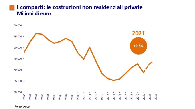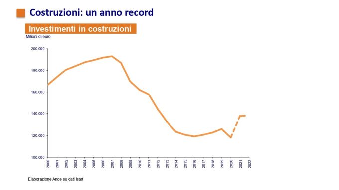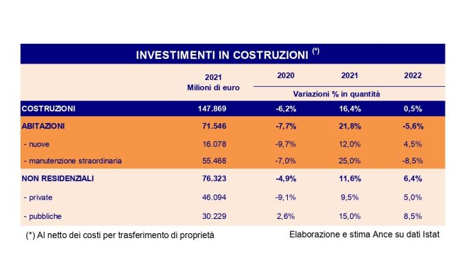 Gli investimenti nel settore cresciuti del 16,4%. Aumentano, rispetto all’anno precedente, produzione, occupazione e ore lavorate. Manutenzione straordinaria delle abitazioni e opere pubbliche i comparti trainanti. Tutti i dati dell’Osservatorio congiunturale dell’associazione nazionale dei costruttori edili. Ma non mancano le criticità, come il caro materiali e la mancanza di manodopera specializzata a cura di Pietro Mezzi Indice degli argomenti: Crescita record Pil oltre le aspettative Gli investimenti in costruzioni Cresce l’occupazione Manca manodopera specializzata I comparti nel 2021 Gli investimenti per comparto Le criticità Pnrr e bonus edilizi: parla il presidente Il caro materiali Per il settore delle costruzioni il 2021 è stato un anno record. È quanto emerge dai dati dell’Osservatorio congiunturale 2022 dell’Ance, presentato nella sede di via Guattani appuntamento cui ha partecipato anche il presidente nazionale dell’associazione Gabriele Buia. La stima che il Centro studi dei costruttori edili compie parla di un incremento, per l’intero settore, del 16,4% in termini generali, un dato confermato da aumenti generalizzati in tutti i comparti. Crescita record Dopo la pandemia e anni di bassa crescita – si legge in un comunicato dei costruttori – l’Italia è tornata a essere tra i principali Paesi europei in termini di sviluppo, un risultato ottenuto soprattutto grazie al settore delle costruzioni che ha rappresentato oltre un terzo della crescita del Pil. Gli investimenti nel settore infatti sono cresciuti del 16,4% con numeri da record: produzione +24,3%, occupazione +11,8%, ore lavorate +26,7%. Si tratta di una crescita importante, che non si registrava da numerosi anni e che – si legge nella nota – “non costituisce solo un mero rimbalzo statistico a seguito dello shock pandemico: il confronto con il 2019, anno pre-pandemico, rimane, infatti, comunque positivo (+9,1%), a conferma che le costruzioni si sono avviate verso una graduale ripresa. La crescita del 2021 consentirà di recuperare ampiamente i livelli precovid, dopo la flessione del -6,2% registrata nel 2020”. Pil oltre le aspettative Questo netto miglioramento della situazione del settore si inquadra in un clima economico generale favorevole, in cui lo scorso anno l’economia italiana ha mostrato un forte recupero. Le recenti stime della Commissione europea evidenziano, per 2021, un’ottima performance del Pil italiano, tra le migliori in Europa: +6,5% rispetto al 2020. Nel confronto con i nostri principali competitor europei solo la Francia ha registrato un incremento superiore (+7%). “La crescita italiana risulta trainata dalla domanda interna, soprattutto nella parte degli investimenti e tra i settori produttivi spicca l’importante contributo fornito dalle costruzioni – ha sostenuto nella sua presentazione il direttore del centro studi Flavio Monosilio -. Settore che, dopo anni di crisi, è ritornato a svolgere un ruolo trainante per l’economia. L’anno appena concluso ha visto la coesistenza di alcuni elementi, scaturiti dallo shock pandemico: da una parte, le opportunità inedite rappresentate da Pnrr e Superbonus. Tuttavia, nel 2021 sono anche emerse alcune criticità che rischiano di ipotecare seriamente gli scenari di sviluppo tanto auspicati. Le persistenti difficoltà di offerta legate all’indisponibilità di alcune materie prime e di prodotti intermedi a livello globale, nonché la crescita vertiginosa delle loro quotazioni, rischiano di bloccare interi comparti produttivi. Da fine anno, inoltre, è esploso con forza anche il problema dell’inflazione, spinta dall’aumento verticale dei prezzi, soprattutto dei beni energetici. Tali fattori rischiano seriamente di limitare l’espansione dell’economia italiana prevista nel 2022”. Per l’anno in corso le previsioni Ance si riducono, delineando una sostanziale tenuta (+0,5%) del mercato dovuta soprattutto a un 8,5% della manutenzione a causa del ridimensionamento di alcuni bonus edilizi e di un periodo di blocco nella cessione dei crediti in seguito alle modifiche normative. Bene invece le performarce delle opere pubbliche grazie ai cantieri del Pnrr, anche se sulla piena realizzazione del Piano pesano alcune incognite dovute al caro materiali. Gli investimenti in costruzioni Anche i dati Istat di contabilità nazionale, riferiti agli investimenti in costruzioni, evidenziano un marcato aumento tendenziale nei primi nove mesi dello scorso anno (sull’intensità della variazione della prima parte del 2021 pesa il confronto con i livelli eccezionalmente bassi dei mesi di aprile e maggio 2020, determinati dalle misure restrittive sull’attività nell’intero territorio nazionale). Positivi anche i dati sui permessi di costruire riferiti ai primi nove mesi del 2021 a conferma di un trend positivo ormai in atto da diversi anni e solo parzialmente interrotto dal risultato negativo del 2020. In particolare, per il comparto residenziale, sempre nel periodo considerato si registra una crescita del 28% per le nuove abitazioni concesse, mentre per il non residenziale l’aumento risulta pari al 19,5%. Cresce l’occupazione La ripresa dei livelli produttivi nel settore ha positivamente influenzato anche i livelli di occupazione. Nei primi undici mesi del 2021, secondo il monitoraggio della Cnce (Commissione nazionale casse edili) su 114 casse edili-edilcasse il numero di ore lavorate è cresciuto del 26,7% rispetto allo stesso periodo del 2020, mentre i lavoratori iscritti sono aumentati dell’11,8% nello stesso periodo. A sua volta, l’anno pandemico si era chiuso con un -8,6% di ore lavorate e di un +3,7% di lavoratori iscritti. Il miglioramento nel mercato del lavoro è confermato anche dai dati Istat sulle forze di lavoro che evidenziano, nei primi nove mesi del 2021, un aumento degli occupati nelle costruzioni dipendenti e indipendenti – del 7,2% nel confronto con lo stesso periodo del 2020. Tale recupero, t