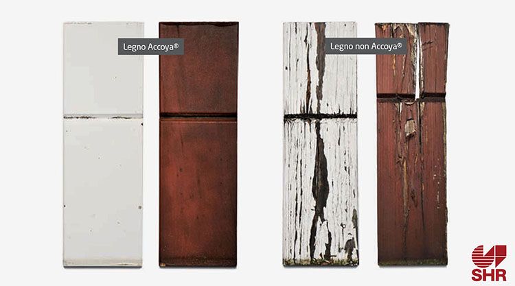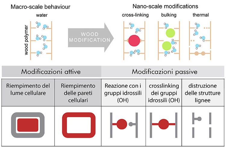 Accoya è un legno dalle prestazioni superiori (per durabilità, caratteristiche meccaniche e fisiche), completamente atossico e riciclabile al 100%. Prodotto dell’acetilazione, un processo ecologico di modifica molecolare, forte di un secolo di sperimentazione. Indice degli argomenti: I meccanismi di modifica del legno L’acetilazione del legno Accoya: il legno superiore Durabilità classe 1 Stabilità dimensionale Prestazioni dei rivestimenti migliorate Il potenziale strutturale di Accoya Il processo produttivo Accoya Sostenibilità, economia circolare, LCA Accoya: esempi, opere, applicazioni Scenari futuri e potenzialità Il legno acetilato è commercializzato fin dal 2007 dall’Azienda Accsys con il nome Accoya, è un super legno progettato per essere utilizzato in applicazioni esterne per l’edilizia, come alternativa ecologica ed efficace rispetto ai conservanti tossici tradizionali o biocidi. L’acetilazione applica una modifica a livello molecolare che cambia la struttura del legno stesso, migliorando molte delle sue caratteristiche prestazionali, soprattutto la durabilità naturale e la stabilità dimensionale. Il legno, per via della sua natura organica, è soggetto a fenomeni di degrado biologico che variano secondo l’esposizione alle intemperie ed al sole. I trattamenti preservanti hanno la funzione di aumentare la resistenza e difendere il legname da costruzione dai principali agenti di degrado biologico: funghi, insetti, organismi marini e fuoco. E lo fanno, da una parte riducendo la capacità di imbibizione del legno (igroscopicità), dall’altra distruggono il cibo gli organismi xylofagi. La modifica del legno (chimica, termica o impregnazione) come l’acetilazione, va a migliorare le proprietà fisiche, meccaniche o estetiche del legno. Questo processo produce un materiale che può essere smaltito alla fine del ciclo di vita di un prodotto senza presentare rischi ambientali maggiori di quelli associati allo smaltimento del legno naturale. Il risultato è un super legno che non teme le più estreme condizioni ambientali, a contatto con acqua e umidità. Le applicazioni possibili, sia portanti che non, sono numerosissime e limitate solo dalla fantasia del progettista: decking e passerelle esterne, rivestimenti di facciate, strutture ipogee, ponti, infissi e arredi da giardino. I meccanismi di modifica del legno Il legno, essendo materia organica, è per sua natura soggetto a fenomeni di degrado biologico. Seppur è vero che il durame di alcune specie legnose (Robinia, gelso rosso, cedro…) produce tossine naturali che le rende resistenti agli insetti e alla decomposizione, la gran parte del legname da costruzione è invece deperibile. Il nemico numero uno del legno è l’acqua. L’assorbimento e il rilascio dell’umidità provocano rigonfiamenti/ restringimenti, fessurazioni, cedimenti del rivestimento e degradazione della superficie. Inoltre, favorisce la crescita di funghi e muffe responsabili della decomposizione. Se combinata con l’energia ultravioletta porta a fenomeni di erosione e cambiamenti di colore. La chiave per migliorare la stabilità e la durata è controllare la quantità di umidità nella parete cellulare. Vari tipi di degrado biologico nel legno naturale Tradizionalmente, il problema della durabilità naturale dei manufatti in legno è stato risolto, da una parte con l’utilizzo di specie legnose durevoli, come i legni duri tropicali (di scarsa disponibilità e sostenibilità), dall’altra applicando prodotti conservanti o biocidi sottoforma di vernici, impregnanti e resine che hanno si prolungato la durabilità del legno trattato, ma con risvolti nocivi per la salute umana (emissioni di VOC) e l’ambiente. Ma oggi, per fortuna, esiste un’alternativa: parallelamente all’industria dei conservanti tossici (es. rame, cromo, arsenico, creosoto, ecc), infatti, attualmente stimata in 30.000 tonnellate, le preoccupazioni ambientali hanno incentivato una ricerca finalizzata al miglioramento delle proprietà del legno, senza alterare la natura ecologica del materiale: la cosiddetta modifica del legno, così definita da Callum Hill (2006): “La modifica del legno implica l’azione di un agente chimico, biologico o fisico sul materiale, con conseguente miglioramento delle proprietà desiderate durante la vita utile del legno modificato. Il legno modificato dovrebbe essere di per sé non tossico in condizioni di servizio e, inoltre, non dovrebbe esserci alcun rilascio di sostanze tossiche durante il servizio, o alla fine della vita, dopo lo smaltimento o il riciclaggio del legno modificato”. Tutti i possibili tipi di trattamenti del legno influenzano il meccanismo di interazione legno-acqua. La modifica del legno può comportare modifiche attive, che si traducono in un cambiamento della natura chimica del materiale, come l’acetilazione, o modifiche passive, in cui si verifica un cambiamento nelle proprietà senza alterare la chimica del materiale, come l’impregnazione o il trattamento termico (una variante, usata da tempi remotissimi, è la carbonatazione o Yakisugi). La maggior parte dei metodi di modifica attivi studiati fino ad oggi hanno coinvolto i gruppi idrossilici polimerici della parete cellulare che svolgono un ruolo chiave nell’interazione legno-acqua, formando legami idrogeno tra i gruppi idrossilici e le singole molecole d’acqua. Trattamenti di modifica del legno e principi di azione (Holger Militz) La modifica viene quindi applicata per superare i punti deboli del materiale principalmente legati alla sensibilità all’umidità, bassa stabilità dimensionale, durezza e resistenza all’usura, bassa resistenza al biodeterioramento contro funghi, termiti, piralidi marini e bassa resistenza all’irradiazione UV. Volumi di produzione stimati per alcuni tipi di legno modificato (Jones et al. 2019) Le più diffuse forme di modifica del legno sono l’acetilazione, la furfurilazione, il trattamento termico e l’impregnazion