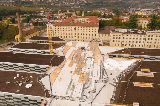 Dopo due anni di lavori, l’ex Manifattura Tabacchi ritorna a nuova vita. Nei nuovi edifici ospiterà l’hub della green & sport economy. L’intervento, voluto da Trentino Sviluppo e realizzato con fondi europei, vale oltre 45 milioni di euro. Otto fabbricati su undici realizzati con strutture in legno. I vantaggi della produzione off-site Vista dall’alto dell’ex Manifattura Tabacchi di Rovereto (credits, Trentino Sviluppo) Indice degli argomenti: Le nuove funzioni La storia della Manifattura Tabacchi Il masterplan L’idea di progetto I telai degli edifici Il portale principale Le travi del tunnel I giunti sismici I solai La produzione prefabbricata Ci sono voluti due anni, un mese e sette giorni per concludere i lavori di riqualificazione dell’ex Manifattura Tabacchi di Rovereto. In sostituzione della vecchia fabbrica di Borgo Sacco, centro medievale affacciato sull’Adige, trova ora spazio Be Factory, un hub della green & sport economy, voluto da Trentino Sviluppo per ospitare aziende e centri di ricerca. L’opera di rifunzionalizzazione dell’antica fabbrica della metà dell’Ottocento è iniziata diversi anni fa con il masterplan di Kengo Kuma del 2010. I nuovi edifici, progettati secondo criteri di efficienza energetica e a contenuto impatto ambientale, ospiteranno aziende innovative presenti nei settori della tutela dell’ambiente, delle biotecnologie, della mobilità sostenibile, dell’industria dello sport e dell’edilizia Alto il valore dell’operazione: 45,6 milioni di euro, provenienti dai fondi di sviluppo europeo (80% Fsc e 20% Fesr), che hanno generato un importante indotto sul territorio, coinvolgendo complessivamente 80 imprese, di cui 40 trentine, e dato lavoro a 600 addetti, tra tecnici e operai. Costruzione della copertura (credits Colombo Costruzioni) Grande è la soddisfazione di Trentino Sviluppo per il risultato raggiunto, che dopo anni di lavoro vede premiati gli sforzi di una rigenerazione che avrà anche l’effetto di riaprire uno spazio chiuso da decenni. Una riapertura garantita anche dalla realizzazione in copertura di un camminamento pedonale di 18mila metri quadrati di superficie: “il tetto verde più grande d’Italia”, affermano i promotori. Le nuove funzioni Il complesso, che si compone di due parti distinte – da un lato lo storico edificio dell’Orologio, dall’altra una gradinata e una rampa che si congiungono con la ciclabile lungo il torrente Leno -, è collocato a una quota inferiore rispetto all’ingresso dall’edificio storico: nella parte interrata sono stati realizzati 25mila metri quadrati di moduli produttivi di legno e vetro, nati sul concept progettuale dell’architetto giapponese, e affacciati sulla galleria centrale. Fasi di costruzione del nuovo complesso (credits, Trentino Sviluppo) Con questo intervento Progetto Manifattura – che già ospita nella parte storica riqualificata gli uffici di aziende, centri di ricerca e startup attive nei settori del green-tech, della domotica, della mobilità sostenibile, dello sport e della qualità della vita – completa la propria offerta con un’area pensata per rispondere anche alle esigenze produttive delle imprese. Da quanto fa sapere Trentino Sviluppo, ad oggi gli spazi occupati e opzionati ammontano al 74% del totale. I nuovi edifici produttivi si distinguono per l’estetica e le prestazioni delle soluzioni impiantistiche, necessarie a servire produzioni ad alto contenuto di innovazione, con camere bianche e laboratori per la telemedicina, la robotica e lo studio dei materiali. credits Trentino Sviluppo Nei lavori di ristrutturazione sono stati impiegati sette chilometri di cavi per la fibra ottica, posati oltre 13 mila metri quadrati di pavimentazioni in pietra, gettati più di 30 mila metri cubi di calcestruzzo, prodotti e utilizzati 5.800 metri cubi di pannelli di legno per la struttura portante e 20 mila metri quadrati di facciate continue. Saranno circa 400 i parcheggi interrati a disposizione delle imprese insediate, dei visitatori e del complesso storico, che sarà finalmente liberato dalla sosta dei veicoli. La storia della Manifattura Tabacchi La Manifattura Tabacchi di Rovereto entrò in funzione alla metà dell’Ottocento sviluppandosi rapidamente, tanto che agli inizi del Novecento si contavano duemila addetti. Dopo la crescita dei decenni successivi, arrivò il declino della coltivazione del tabacco nella Vallagarina. La facciata storica della manifattura Tabacchi (riproduzione di una foto di Gabriele Basilico credits Trentino Sviluppo) Nel 1969 la Manifattura iniziò la produzione su commissione della Philip Morris e, l’anno successivo, furono realizzati i nuovi capannoni, con una linea produttiva altamente meccanizzata. Il rapporto della Philip Morris con il Monopolio dello Stato proseguì fino al 2000; successivamente Manifattura diventò proprietà dell’Ente Tabacchi Italiani. La produzione si concluse il 31 marzo 2008. Il masterplan Su iniziativa della provincia autonoma di Trento, qualche anno dopo la chiusura dello stabilimento nasce Progetto Manifattura. Obiettivo: trasformare la storica fabbrica in un centro di innovazione industriale, un incubatore certificato di start up nei settori dell’edilizia ecosostenibile, dell’energia rinnovabile e delle tecnologie per l’ambiente e per lo sport. Nel 2009 venne così costituito un gruppo di progettazione composto da Kengo Kuma & Associates, Carlo Ratti Associati, Arup e Kanso. Al gruppo di progettisti fu chiesto di dare corpo alla visione della nuova manifattura attraverso l’elaborazione di linee guida di progetto. Nel 2010 viene sviluppato un documento di analisi e di proposte che definì i criteri di progettazione. L’idea di progetto Il masterplan di Kengo Kuma si focalizzava sull’integrazione tra vecchio e nuovo, sul rispetto della geometria e delle linee del territorio (come la geometria dei vigneti circostanti), la presenza di un tetto verde di copertura degli spazi produttivi 