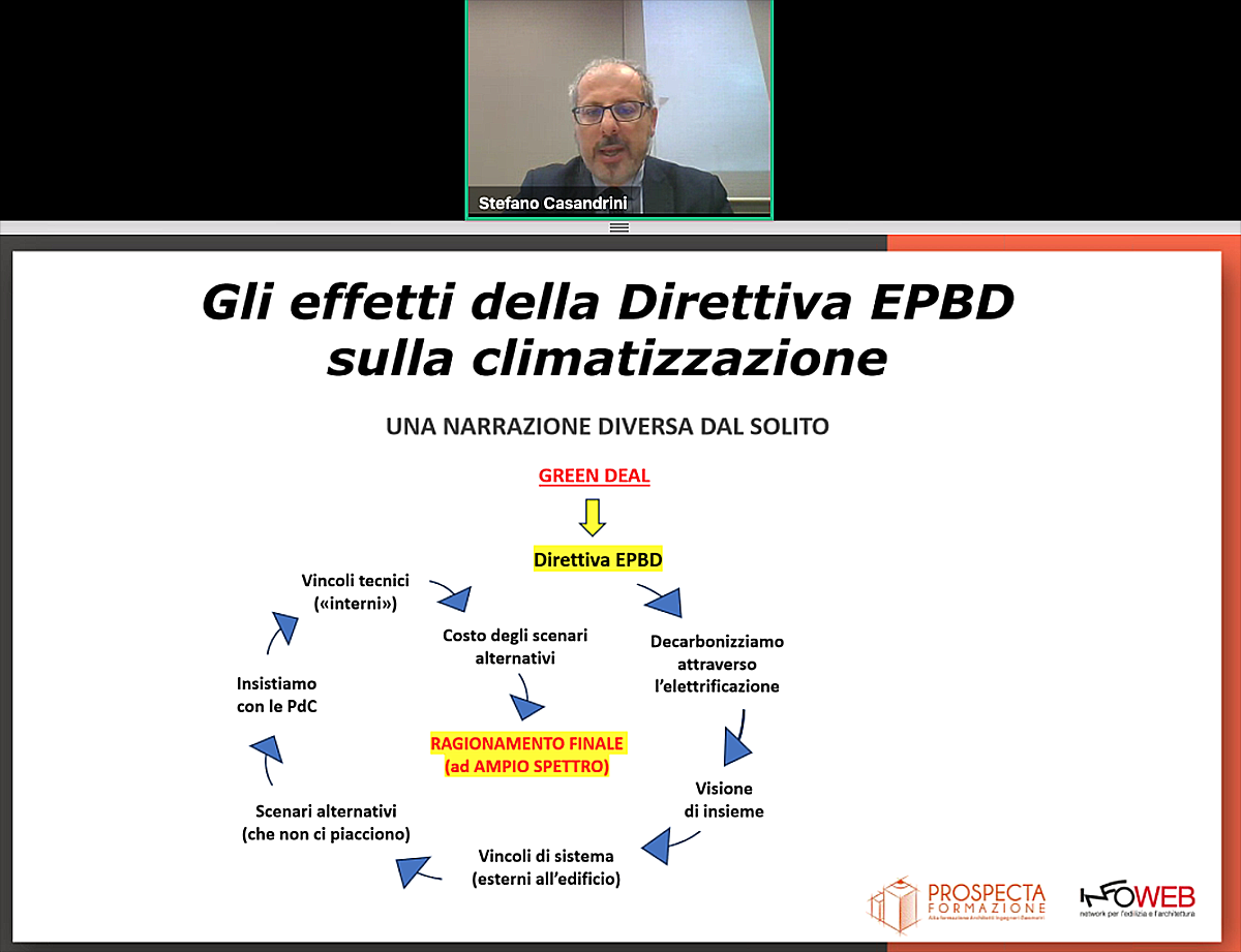 Indice degli argomenti Toggle Riscaldamento, climatizzazione e raffrescamento: obiettivi e sfidePompe di calore nel residenziale: la convenienza c’èDecarbonizzazione del calore industrialeIl ruolo della tecnologia e dell’automazioneClimatizzazione e raffrescamento sostenibili: il caso virtuoso dell’asilo nido nZEB Gli edifici devono essere sottoposti a una profonda revisione per poter rispondere alle necessità di avere migliori prestazioni energetiche, riducendo consumi ed emissioni, e garantire ai residenti un adeguato livello di benessere. In poche parole, c’è bisogno di un’edilizia sostenibile e confortevole, oltre che resiliente alle sfide climatiche. A quest’ultimo proposito, l’ultimo report di Copernicus sta a indicare la vera sfida su cui lavorare: assicurare abitazioni e luoghi di lavoro in grado di mantenere a una adeguata temperatura chi li abita e vive. Gli impianti di riscaldamento, climatizzazione e raffrescamento possono, anzi, devono garantire il loro contributo per decarbonizzare il costruito ed evitare di andare a sovraccaricare le reti elettriche. Si contano almeno 2 miliardi di impianti d’aria condizionata (IEA, 2022), prevedendo qui al 2050 il numero triplicherà. Il Centro euro-Mediterraneo sui Cambiamenti Climatici (CMCC) stima che la quota di famiglie dotate di aria condizionata potrebbe aumentare dal 27% attuale a una percentuale compresa tra il 33% e il 48% entro il 2050. Se l’Europa punterà sulla transizione energetica, l’elettrificazione dei consumi richiederà sufficiente quantità di energia per alimentare gli impianti di riscaldamento e raffrescamento presenti, senza provocare problemi alla rete elettrica. Sono sfide da affrontare e che richiedono soluzioni tecnologiche efficienti e performanti, resilienti e in grado di garantire comfort. Su cosa puntare lo hanno spiegato i relatori del convegno “Climatizzazione e raffrescamento sostenibile: innovazioni per il comfort negli edifici residenziali e industriali”, organizzato da Prospecta Formazione – Infoweb. Riscaldamento, climatizzazione e raffrescamento: obiettivi e sfide Gli impianti di riscaldamento, climatizzazione e raffrescamento sono oggetto di importanti cambiamenti con l’arrivo della direttiva EPBD che l’Italia dovrà recepire nel 2026. Stefano Casandrini, policy officer di Assotermica, ha messo in evidenza le implicite difficoltà a garantire il raggiungimento degli obiettivi di decarbonizzazione e di efficienza energetica nel patrimonio edilizio esistente. Ricordando l’ammissione inserita nella Dichiarazione di Chatillot, sottoscritta da 70 Paesi a marzo 2024 nell’ambito del Forum delle Nazioni Unite, in cui si riconosceva che il settore edile è “difficile da decarbonizzare”, ha affermato che «gli edifici residenziali non sono cablati per il riscaldamento elettrico», rischiando di mettere in difficoltà la rete esistente. Le pompe di calore full electric impongono determinate caratteristiche spaziali e progettuali per poter essere installate, specie in edifici esistenti. A oggi «i sistemi ibridi factory made sono l’unica soluzione affidabile per il cittadino per molteplici motivi, uno dei quali è la garanzia di contare su un’unica soluzione (l’ibrido factory made contempla, in un impianto integrato, caldaia a condensazione e pompa di calore), realizzata da un unico produttore», un vantaggio anche in termini di manutenzione e di assistenza. Inoltre, va considerato che sono un elemento di competitività industriale per l’Italia: i sistemi ibridi factory made, infatti, sono nati in Italia e rappresentano un fiore all’occhiello dell’industria nazionale, utili per raggiungere gli obiettivi di decarbonizzazione. Inoltre, sono tra le prime tecnologie a essere incentivate con il Conto termico. Pompe di calore nel residenziale: la convenienza c’è Nel novero delle soluzioni per riscaldamento, climatizzazione e raffrescamento, le pompe di calore elettriche sono le principali candidate per garantire prestazioni e contribuire alla decarbonizzazione dell’edilizia. A oggi pagano ancora costi di investimento sensibilmente superiori a quella basata su caldaia a condensazione, «anche in ragione del fatto che nella maggioranza dei casi sono previsti significativi interventi per la sostituzione del sistema di diffusione del calore», ha spiegato Lorenzo Croci, Responsabile dei Laboratori di Efficienza Energetica di RSE e co-autore di uno studio condotto su 78 casi studio, da abitazioni monofamiliari ai condomini, in zone climatiche diverse e con vetustà differenti. Sono state valutate otto possibili soluzioni tecnologiche, dalla caldaia tradizionale alla pompa di calore a bassa temperatura combinata col fotovoltaico. Se il costo iniziale premia le caldaie a condensazione, i risparmi energetici evidenziano una superiorità sostanziale delle PdC di qualsiasi tipologia. Inoltre, in termini di sCOP (Coefficiente di prestazione stagionale) minimo di convenienza, «ai prezzi attuali dell’energia è sufficiente un valore di COP medio stagionale di circa 2,5 per avere un risparmio economico sulla bolletta energetica di una abitazione residenziale. Valore ottenibile dai semplici climatizzatori split e dalle moderne PdC anche con terminali a media/alta temperatura». C’è un ulteriore motivo che avvantaggia la scelta di una pompa di calore, specialmente nelle abitazioni monofamiliari (nelle plurifamiliari potrebbe essere sufficiente un incentivo per l’acquisto): il prezzo futuro dell’energia elettrica. «Secondo le valutazioni di scenario RSE il prezzo dell’energia elettrica nel prossimo futuro sarà destinato a ridursi, grazie all’impiego sempre più importante delle fonti rinnovabile (fotovoltaico in primis) e dall’introduzione a partire dal 2027 dell’ETS2 che graverà sui costi del gas». Oggi i costi dell’ETS sono già applicati in fase di produzione dell’energia elettrica, ma non sul gas. Decarbonizzazione del calore industriale Oltre al