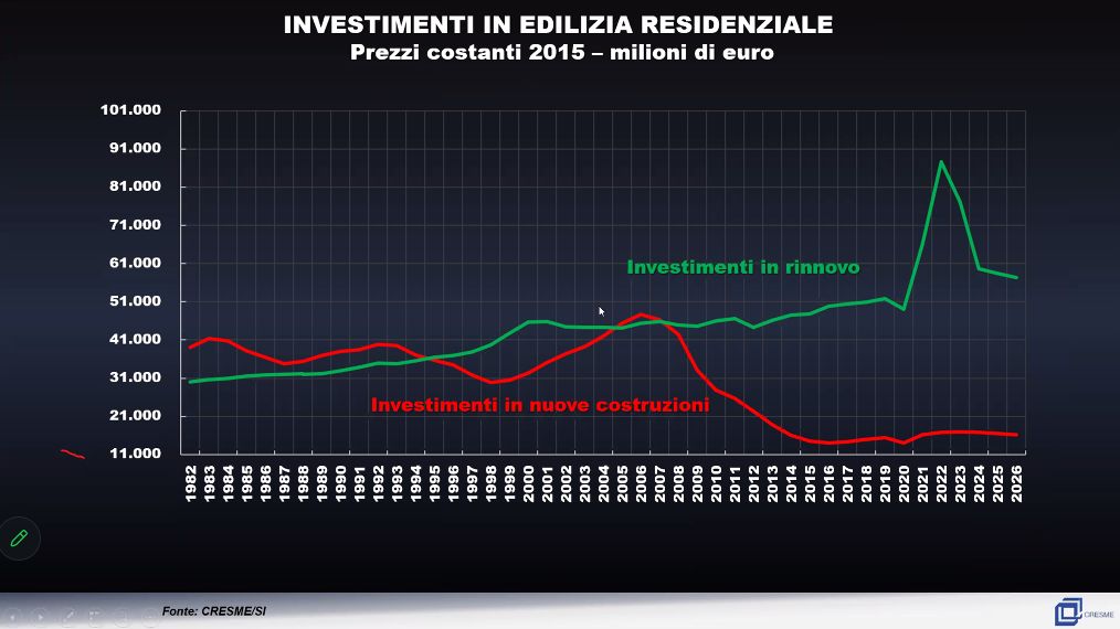 Indice degli argomenti Toggle La situazione dell’economia mondialeIl protagonismo delle costruzioni“Giù da un treno, su di un altro”Finita l’euforia, c’è incertezza Un documento ricco di numeri e considerazioni quello presentato martedì scorso dal direttore del Cresme di Roma, Lorenzo Bellicini, in occasione della XXXIV edizione del Rapporto congiunturale e previsionale delle costruzioni, quest’anno dedicato al “Mercato delle costruzioni 2023-2026”. La lunga relazione del direttore del Cresme si è sviluppata attorno ai principali temi dell’economia mondiale e nazionale, per giungere poi a tratteggiare il profilo attuale e futuro delle costruzioni in Italia. Bellicini ha suddiviso la sua relazione in tre parti: la prima incentrata a definire il contesto economico internazionale in cui il settore delle costruzioni è inserito; la seconda dedicata a ricostruire quanto accaduto nel periodo 2019-2022, tenuto conto che il 2021 e il 2022 sono stati anni di forte crescita del settore; la terza dedicata alla costruzione di scenari nel periodo 2023-2026. La situazione dell’economia mondiale “Rispetto a solo un anno fa – ha attaccato il direttore del Cresme – a livello globale assistiamo a una fase economica profondamente diversa da quella precedente. Un anno fa l’inflazione era ai livelli minimi, oggi è il tema dominante delle politiche economiche internazionali. Siamo, e lo saremo anche nei prossimi anni, in una fase caratterizzata da inflazione, tassi di interesse e costo del danaro alti. Siamo passati dal rischio di stagflazione e recessione di qualche tempo fa a una fase caratterizzata da valori molto alti di inflazione”. Alle incertezze, per fortuna superate, della pandemia e del post-pandemia, si sono aggiunte quelle dovute allo scoppio della guerra in Ucraina e alla competizione economica sempre più accesa tra Cina e Stati Uniti. In questo contesto non devono meravigliare i dati economici della quasi totalità dei Paesi, che fanno registrare valori di crescita del Pil tra i più bassi di questo inizio di secolo. Siamo in presenza di un rallentamento delle economie mondiali, una tendenza confermata anche dai recenti dati diffusi dal Fondo monetario internazionale. “In questo nuovo contesto – ha proseguito Bellicini – l’Italia ha mostrato un comportamento differente rispetto a quello fatto registrare dall’inizio dell’anno Duemila. A differenza di altri Paesi, il nostro ha avuto performance migliori delle attese”. Previsioni di crescita del Pil nazionale 2022-2023 (elaborazione Cresme su fonti varie); a destra, Lorenzo Bellicini, direttore del Cresme durante la presentazione del XXXIV Rapporto congiunturale In questo quadro generale, nei singoli Stati, il mercato delle costruzioni ha perso la capacità di traino del prodotto interno lordo. “Vi è stata in particolare una contrazione del comparto residenziale, dovuta alla crescita contenuta fatta registrare dall’economia cinese e da quelle di Stati Uniti ed Europa. A trainare il comparto delle costruzioni sono state proprio le opere pubbliche e di ingegneria civile”. Investimenti in edilizia residenziale 1982-2026 (fonte, Cresme/SI) Il protagonismo delle costruzioni “Alla luce dei dati macro economici – ha aggiunto il direttore – possiamo dire che in questi anni l’Italia ha operato bene dal punto di vista degli indicatori economici: i nostri sono dati migliori rispetto a quelli fatti registrare da altri Paesi europei. In questo contesto favorevole, è stato il settore delle costruzioni a essere protagonista della crescita del Paese sia nel 2021 che nel 2022”. I fattori del boom delle costruzioni 2021-2022 (fonte Cresme) Per l’anno in corso Cresme prevede un leggero calo della produzione del comparto delle costruzioni, in cui stanno rallentando i lavori di riqualificazione. Un effetto dovuto anche all’onda alta dei due anni precedenti. “Giù da un treno, su di un altro” È questa la metafora utilizzata dal direttore del Cresme per indicare che, concluso il ciclo degli incentivi (Superbonus, sismabonus, bonus facciate …), si apre una nuova fase di sviluppo rappresentata dall’attuazione dei progetti del Piano nazionale di ripresa e resilienza, che devono essere realizzati in tempi stretti. La nuova fase di mercato 2022-2023 (fonte, Cresme) Ma il Pnrr non racconta tutta la vitalità del settore. “Le opere pubbliche – afferma Bellicini – non sono solo Piano nazionale di ripresa e resilienza. E questo è forse il dato più interessante e caratterizzante del Rapporto congiunturale di quest’anno. Il mercato delle opere pubbliche è cambiato anche senza il Pnrr. Basti osservare i dati del triennio 2019-2021: in questi tre anni sono stati messi a gara, in media, qualcosa come 40 miliardi di euro all’anno. E nel 2019 e anche nel 2020 di Piano nazionale ancora non se ne parlava. Solo nel 2021 il Pnrr ha fatto sentire i suoi effetti, in particolare su appalti di opere ferroviarie. Quello che abbiamo di fronte, con il consistente ammontare delle risorse, è un quadro di modernizzazione del Paese, che riguarda la rete ferroviaria, quella stradale, gli aeroporti, i porti, i nodi di connessione, lavori che sono maturati proprio in quegli anni. L’onda delle opere pubbliche ha iniziato a muoversi e avrà tempi realizzativi differenti da Pnrr. Di queste tendenze il mondo delle costruzioni dovrà tenerne conto”. I fondi del PNRR e del React-Eu (fonte, Cresme) La presentazione dei dati del XXXIV Rapporto congiunturale si è poi soffermata ad analizzare l’andamento del settore negli anni 2019, 2020, 2021 e 2022 (vedi le immagini pubblicate in questo articolo; nda). Finita l’euforia, c’è incertezza Secondo i dati del Cresme, per le costruzioni il 2023, anno contraddistinto da un quadro internazionale incerto (guerra, inflazione, politiche finanziarie restrittive, alto costo del denaro, freno ai mutui e alle compravendite), sarà un anno di difficoltà in cui la crescita 