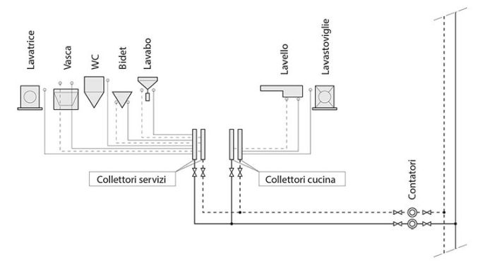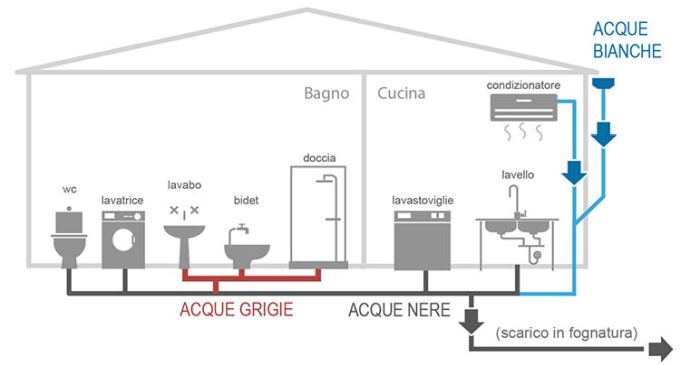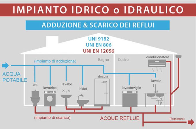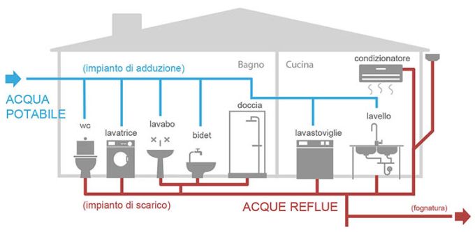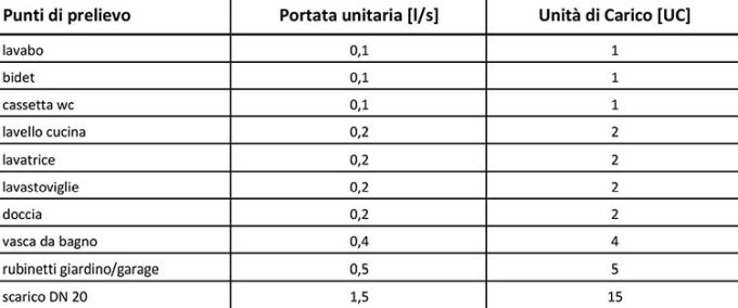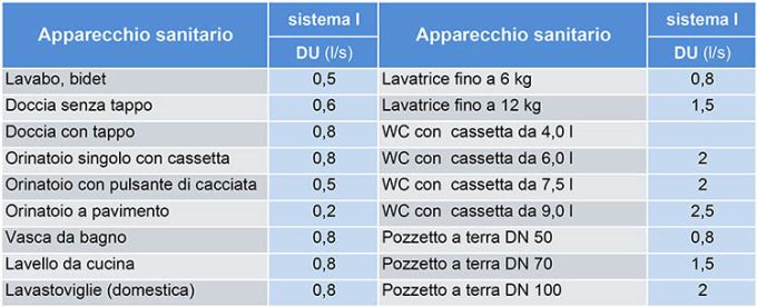 Progettazione, calcolo e dimensionamento, secondo la normativa vigente, del sistema di scarico delle acque reflue: reti, diramazioni e colonne di scarico Indice degli argomenti: Lo scarico delle acque reflue (UNI EN 12056) Componenti dell’impianto di scarico La ventilazione degli scarichi Progetto, calcolo e dimensionamento delle reti di scarico Dimensionamento delle diramazioni di scarico (senza ventilazione) Dimensionamento delle colonne di scarico Collaudo e messa in funzione dell’impianto In un precedente articolo abbiamo trattato il tema dell’impianto idrico, idraulico o idrosanitario domestico, di adduzione e scarico delle acque reflue in generale. Oggi vediamo di addentrarci nella progettazione, calcolo e dimensionamento, secondo la normativa vigente, del sistema di scarico delle acque reflue: reti, diramazioni e colonne di scarico. L’impianto idraulico è quel sistema di condotte e tubazioni che alimentano i servizi igienici del bagno wc, lavabo, bidet, doccia- la lavatrice, il lavello della cucina e la lavastoviglie. Dalla rete pubblica, posta sotto la strada o il marciapiede e, attraverso una rete di tubazioni, valvole e pompe, l’acqua potabile arriva direttamente nella nostra abitazione sia essa casa unifamiliare o appartamento in condominio – per soddisfare i nostri bisogni: da bere o per cucinare, lavare le stoviglie o i vestiti, per l’igiene personale. Da qui, poi la rete di scarico permetterà ai liquami di defluire verso la rete fognaria comunale. Lo scarico delle acque reflue (UNI EN 12056) Gli impianti domestici devono essere progettati a regola d’arte, nel rispetto del DM 37/08 ed in conformità alle norme tecniche armonizzate europee. La normativa di riferimento per gli impianti di scarico delle acque reflue è la UNI EN 12056:2001 (Sistemi di scarico funzionanti a gravità all’interno degli edifici – Impianti per acque reflue, progettazione e calcolo). La norma, divisa in 5 parti, indica requisiti e prestazioni e fornisce indicazioni per la corretta progettazione e calcolo di impianti per acque reflue e sistemi per l’evacuazione delle acque meteoriche. Oltre a modalità d’installazione, istruzioni per l’esercizio, la manutenzione e l’uso. Le acque reflue si definiscono domestiche se provenienti da insediamenti di tipo residenziale e derivanti prevalentemente dal metabolismo umano e da attività domestiche (art.74, D.Lgs n. 152/06). Contaminate dall’uso e solitamente scaricate da WC, docce, vasche da bagno, bidè, lavabi, lavelli e pozzetti a terra, secondo le definizioni date dalla norma UNI EN 12056, possono classificarsi in: Acque grigie: acque reflue provenienti da lavaggi (saponose) Acque nere: acque reflue provenienti dall’organismo umano (che contengono materia fecale o urina) Acque bianche o meteoriche: acque derivanti da precipitazioni naturali Per “Impianti di Scarico” si intende quell’insieme di tubazioni, raccordi e apparecchiature necessarie a ricevere, convogliare e smaltire le acque usate provenienti dagli apparecchi sanitari ad uso domestico. Solitamente le acque bianche vengono convogliate separatamente dai reflui domestici e vanno direttamente nel terreno. Le reti di scarico devono consentire l’evacuazione, rapida e senza ristagni, delle acque di rifiuto verso il sistema di smaltimento esterno. A tal fine si devono realizzare le opportune pendenze e scegliere diametri adeguati per i tubi. Devono inoltre essere resistenti alle sollecitazioni meccaniche, termiche ed alle azioni corrosive dei liquami. È inoltre fortemente raccomandabile utilizzare tubazioni e dispositivi isolati acusticamente onde evitare rumori eccessivi. Numerosi sono i tipi di sistemi di scarico di acque reflue oggi in uso, ma in Europa e anche in Italia, si preferisce dimensionare le diramazioni di scarico – a cui sono connessi i sanitari – supponendo un grado di riempimento pari a 0,5 (50%) con relativa connessione ad un’unica colonna di scarico (Sistema 1 indicato nella UNI EN 12056-2). Questa soluzione tecnica garantisce minori livelli di rumorosità ed evita sensibilmente il rischio di perdita della guardia idraulica dei sifoni. Componenti dell’impianto di scarico Un sistema di scarico all’interno degli edifici è costituito dai seguenti componenti fondamentali: sifone: Dispositivo installato direttamente agli apparecchi sanitari avente lo scopo di impedire il passaggio di cattivi odori mediante tenuta idraulica; diramazione di scarico: Tubazione a sviluppo prevalentemente orizzontale che collega gli apparecchi sanitari ad una colonna di scarico o ad un collettore di scarico; colonna di scarico: Tubazione a sviluppo prevalentemente verticale che convoglia le acque reflue provenienti dagli apparecchi sanitari; collettore di scarico: Tubazione sub-orizzontale, installata a vista all’interno di un edificio o interrata, alla quale sono raccordate le colonne di scarico o gli apparecchi sanitari del piano terreno; colonna di ventilazione: Tubazione prevalentemente a sviluppo verticale, raccordata ad una colonna di scarico, avente la funzione di limitare le variazioni di pressione all’interno di quest’ultima. La colonna di ventilazione può coincidere con la colonna di scarico ma, in tal caso, dovrà essere prolungata oltre la copertura per captare l’aria esterna o essere provvista di una valvola di aereazione. Il sifone, elemento di raccordo tra l’apparecchio sanitario e le tubazioni del sistema di scarico, ha la funzione di impedire la penetrazione dei cattivi odori nell’edificio. La profondità della tenuta idraulica (H) del sifone, ovvero la profondità dell’acqua che dovrebbe essere eliminata da un sifone completamente pieno, prima che i gas ed i cattivi odori a pressione atmosferica possano attraversare il sifone, non deve essere minore di 50 mm. Esistono 3 tipologie standard di sifone per gli apparecchi sanitari domestici: sifone a S (o a collo d’oca) sifone a bottiglia sifone a colonna Un corretto sistema di sca