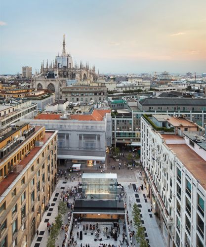 Milano una città sempre più internazionale e cosmopolita: inaugurato il nuovo store Apple, progetto firmato Foster che comprende una grande piazza pubblica aperta alla comunità con una scenografica fontana. Inaugurato a Milano l’Apple store di piazza Liberty, nei pressi di Corso Vittorio Emanuele, firmato da Norman Foster, un progetto che ha trasformato la piazza che ora sarà aperta al pubblico 24 ore al giorno e ospiterà eventi speciali. 2 sono gli elementi fondamentali che caratterizzano il progetto: la piazza rivestita in Beola Grigia, tipica della Lombardia, e circondata da 14 alberi di Gleditsia Sunburst e una fontana in vetro che funge da ingresso al negozio e fa da sfondo al grande anfiteatro all’aperto che ospiterà concerti e workshop. L’anfiteatro è definito da ampi gradini in pietra che scendono sotto il livello della strada e si aprono su un palco, sorretti da un secondo muro d’acqua della fontana. Il 26 luglio è stato inaugurato il nuovo Apple Sore di Piazza Liberty a Milano con migliaia di persone L’acqua diviene elemento centrale e regala un’esperienza interattiva e multisensoriale grazie ai suoni dei getti d’acqua verticali che si riversano sulle pareti di vetro e ai colori che cambiano nel corso della giornata al filtrare della luce del sole, mentre di notte il soffitto di vetro crea un effetto caleidoscopico, con l’acqua che cade lungo le pareti e i suoi riflessi che viaggiano verso il cielo. L’acqua è un elemento centrale nuovo store Apple di Milano. Img by Foster + Partners Lo store di piazza Liberty rappresenta la nuova concezione del design retail di Apple: uno spazio che vada oltre l’idea di negozio e che rappresenti un luogo di ritrovo, che ospiterà i programmi di Today at Apple, con le varie sessioni gratuite che si alternano dedicate a fotografia, filmmaking, creazione di musica, programmazione, design… Per tutto il mese di settembre lo store Apple ospiterà la Milan Series, durante la quale 21 artisti locali condivideranno la loro visione sul futuro creativo di Milano. L’interno è uno spazio luminoso, monolitico, metaforicamente scolpito nella stessa pietra della piazza soprastante. Il soffitto segue il profilo a gradoni dell’anfiteatro, con lucernari e pannelli retroilluminati che combinano in modo innovativo luce artificiale e naturale. Img by Foster + Partners Attraverso il tetto e le scale, il sole penetra in profondità nel negozio, collegando l’interno con la luce e il ritmo di Milano e dando l’impressione di una spaziosa galleria d’arte piena di luce diurna. Le scale che conducono al negozio sono costituite da gradini a sbalzo rivestiti in acciaio inox lucido che diventano anche un’installazione luminosa scultorea, creando un’esperienza teatrale ed emozionante. Consiglia questo approfondimento ai tuoi amici Commenta questo approfondimento