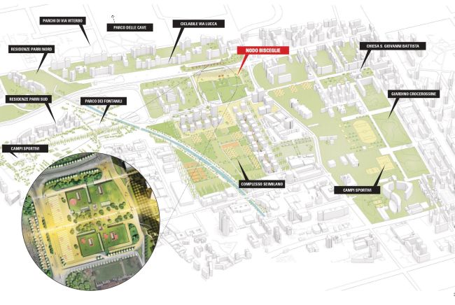 L’architetto bolognese ridisegna la stazione metropolitana di Bisceglie, nella zona ovest della città. Non più luogo anonimo, ma spazio multifunzionale di qualità. Una piazza che diventa parco sportivo, un’oasi urbana, un parcheggio che nel fine settimana diventa un luogo per concerti Planimetria del quartiere SeiMilano e dell’hub Bisceglie (render Mca) Si chiamerà Bisceglie Play-Hub. Sarà il nuovo volto della stazione metropolitana del quartiere Bisceglie nella zona sud ovest di Milano. Il progetto porta la firma di Mario Cucinella Architects e con l’architetto bolognese ci sono anche l’impresa Borio-Magiarotti e Planet Idea, che già collaborano alla realizzazione del nuovo quartiere SeiMilano in costruzione sull’area Calchi-Taeggi. L’idea di Cucinella è di trasformare un’anonima stazione di interscambio in una nuova piazza da vivere, collegata al nuovo quartiere Calchi Taeggi con una passeggiate verde. Le nuove funzioni previste dal progetto (render Mca) Una piazza che sopra diventerebbe un parco sportivo, un’oasi urbana, mentre sotto verrebbe realizzato un parcheggio che, nel fine settimana, potrebbe essere utilizzato come luogo capace di ospitare concerti e iniziative pubbliche. La proposta di MCA è stata resa pubblica in occasione del call for proposal avviato mesi fa dal comune di Milano, teso a raccogliere idee e proposte per la Milano del 2030. Tra le 35 proposte pervenute agli uffici dell’assessorato all’Urbanistica, che hanno spaziato su diversi temi e luoghi della città, vi era anche quella di Mario Cucinella, che a Milano è di casa. La suggestione nasce da un’analisi del territorio milanese. «L’area a sud-ovest di Milano – scrive Cucinella – sta conoscendo infatti un’importante stagione di sviluppo in cui la città è chiamata a dialogare con la natura, un tessuto verde che connette le corti residenziali, le attrezzature sportive e i parchi urbani. La proposta di rigenerazione del nodo di Bisceglie combina interventi leggeri, ma ad alto valore aggiunto – come il cambio di pavimentazione, l’innesto di micro-servizi e un più efficiente uso delle infrastrutture esistenti e delle loro pertinenze. La proposta si compone di tre interventi strategici lungo l’asse delle vie Calchi Taeggi e Lucca. Una passeggiata verde connette la quota del futuro complesso SeiMilano alla copertura del parcheggio interrato, che può ospitare un vero e proprio Sport Park e un’oasi urbana, proseguendo un modello di sviluppo incentrato sulla città-giardino, mentre al piano interrato si possono immaginare usi temporanei durante il fine settimana. Una copertura leggera organizza i servizi di trasporto esistenti in un hub intermodale, che si affaccia su una nuova piazza continua. L’ampliamento della piattaforma pedonale su via Lucca diviene uno shared space in grado di ospitare, nei giorni di minore affluenza, piccole strutture da destinare alle associazioni o a pop-up market». Consiglia questo approfondimento ai tuoi amici Commenta questo approfondimento