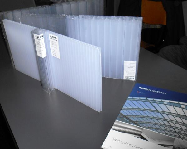 Eccellente resistenza agli urti, elevato isolamento termico, trasparente, duttile: alcune delle principali caratteristiche del policarbonato.Il policarbonato è un polimero amorfo termoplastico: polimero, in quanto il policarbonato è una catena continua di un gruppo carbonico, legata generalmente da un gruppo chimico derivato dal Bisfenolo; ha una struttura amorfa non cristallina ed è termoplastico: le sue proprietà meccaniche cambiano in relazione alla temperatura. L’estrusione è un processo a caldo mediante il quale il policarbonato in granuli è condotto, attraverso una tramoggia, in una vite, passando ad uno stato plastico (fuso) per mezzo del quale – passando con continuità attraverso una testa-matrice – ne viene data la forma. Successivamente, una volta raffreddato, manterrà la forma così imposta nel prodotto finito. Nel caso specifico delle lastre, nelle successive fasi del ciclo produttivo, viene applicato un film di protezione e poi si procede al taglio secondo misura e all’imballo. La tecnologia del policarbonato è stata protagonista della lezione agli studenti della Scuola di Architettura, Urbanistica, Ingegneria delle Costruzioni del Politecnico di Milano (Laboratorio di Progettazione di Costruzioni Complesse – Prof. Claudio Sangiorgi) Mercoledì 20 aprile 2016, aula Z.2, Politecnico di Milano, Via Bonardi – Milano Città Studi. Un’occasione unica per gli studenti della Scuola di Architettura di entrare in contatto con il mondo dell’industria per le costruzioni. Ad animare l’attenzione dell’uditorio è stato il Dott. Matteo Borsani, Product Manager di Koscon Industrial S.A., realtà internazionale che produce e distribuisce lastre e sistemi in policarbonato estruso, che prima di tutto ha spiegato cos’è il policarbonato e qual è l’attività della società: la produzione di lastre e sistemi in policarbonato estruso. Esempio di copertura trasparente realizzata con lastre Macrolux® Solid In particolare, ha chiarito il Dott. Borsani, il policarbonato è un polimero che viene degradato dai raggi UV presenti nella radiazione solare: per questo motivo è indispensabile che la faccia esposta dei pannelli venga protetta con specifici assorbitori UV (UV absorber), che ne assicurino la durata e conferiscano al materiale una garanzia di vita utile superiore ai 10 anni. Questo processo di protezione prende il nome di “coestrusione”: grazie ad uno strato esterno di 30 µ (0.03 mm) coestruso, infatti, i prodotti Koscon risultano protetti dai raggi UV, dall’invecchiamento e dall’ingiallimento del materiale, mantenendo pressoché inalterate le caratteristiche fisico meccaniche nel tempo. La presentazione del Dott. Borsani si è poi sinteticamente soffermata sui principali dati della società: fondata nel 1980, Koscon Industrial S.A. è presente in 40 paesi nei 5 continenti, con una capacità produttiva pari a 15.000 ton/anno, ha sede produttiva a Stabio, in Svizzera, e ha cinque società di distribuzione (Co-Ex negli USA, Macrolux UK in UK, Macrolux Benelux nel Benelux, Plastimod in Francia e Taly in Cina). Il Dott. Borsani ha tenuto particolarmente a sottolineare che i prodotti Koscon sono sottoposti a controlli continui di qualità. L’azienda è certificata, infatti, ISO 9001 e lo sviluppo e la qualità dei prodotti Koscon sono garantiti da enti di certificazione internazionale e costituiscono punti qualificanti della mission aziendale. Palestra di scherma, Udine (IT) – 2011 – esempio di realizzazione con l’impiego del sistema Modulit®. Il policarbonato: applicazioni e vantaggi Per mezzo di efficaci esempi ed immagini, la presentazione è proseguita soffermandosi su quelli che sono i principali vantaggi che risultano dall’impiego di questo innovativo materiale, nel più ampio campo delle sue applicazioni: un’eccellente resistenza contro urti e fratture, che lo rende il prodotto ideale per l’uso nei pannelli protettivi; un’alta resistenza termica, che lo rende prodotto ideale in applicazioni che richiedono sterilizzazione; una buona stabilità dimensionale, che permette al materiale di mantenere invariata la forma in molte situazioni; è biologicamente inerte ed è facilmente lavorabile, oltre ad avere un’elevata trasparenza, caratteristica essenziale per le applicazioni in edilizia. Il Dott. Borsani ha successivamente illustrato i principali campi di applicazione, oltre a quello dell’edilizia: per la realizzazione di automobili (specchietti retrovisori, luci posteriori, indicatori di direzione, luci retromarcia, fendinebbia e fari anteriori); nell’imballaggio (bottiglie, contenitori e stoviglie, poiché, essendo praticamente infrangibile, il policarbonato rappresenta un’alternativa sicura al vetro); per elettrodomestici e beni di largo consumo (come bollitori, frigoriferi, frullatori, rasoi, asciugacapelli, soddisfacendo le norme di sicurezza, come quelle sulla resistenza al calore e l’isolamento elettrico); nell’elettronica (leggero, antiurto e infrangibile, il policarbonato ha contribuito a rendere più leggeri computer, cellulari, fax e cercapersone, oltre ad aumentare la resistenza dei prodotti ai colpi, alle scalfitture e alle cadute accidentali). Esempio di serra realizzata con lastre corrugate del tipo Macrolux® Rooflite®. Passando poi al campo di applicazione nell’edilizia, tema centrale del seminario, sono state illustrate le qualità del policarbonato e i vantaggi che ne derivano nell’impiego per il settore “Building & Construction”. La resistenza meccanica del materiale si traduce, in applicazione nel campo delle costruzioni, in resistenza al carico e resistenza all’urto, quindi in maggiore sicurezza. La conducibilità termica propria del policarbonato garantisce un elevato isolamento termico e, quindi, in risparmio. Le proprietà ottiche e di trasparenza consentono il controllo della trasmissione luminosa e, in conseguenza, della luce. La duttilità e lavorabilità proprie del materiale rendono po