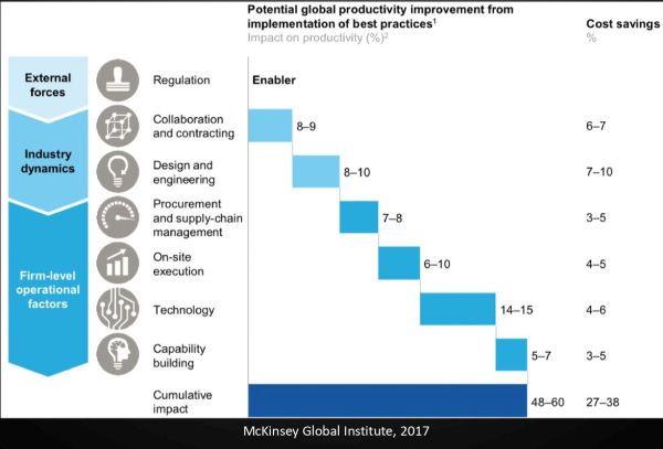 Property & Technology. Parole e concetti nuovi per i settori immobiliare e delle costruzioni. È la tecnologia che impatta sul mondo dell’abitare e del costruire. E la nascita di start-up sta dando una forte spinta in un comparto da sempre resistente all’innovazione. Intervista ad Angelica Donati, ceo di Donati Immobiliare Group Indice degli argomenti: Intervista a Angelica Krystle Donati, ceo di Donati Immobiliare Group L’interesse al Proptech del settore delle costruzioni La rivoluzione digitale nel settore delle costruzioni Proptech è la crasi delle parole proprietà (property) e tecnologia (technology). Il termine fa riferimento a tutti gli aspetti della tecnologia che impattano sull’ambito della costruzione e della gestione della proprietà intesa come asset real estate. È un termine generale onnicomprensivo: può includere software, hardware, materiali o processi di produzione, ma è spesso usato per riferirsi specificamente alle piccole start-up che utilizzano la tecnologia per affrontare i problemi delle rispettive nicchie di mercato nel comparto delle costruzioni. La definizione di Proptech non è unica: in uno studio del Politecnico di Milano vi si trovano differenti definizioni, tra cui quella della Royal Institution of Chartered Surveyors che indica Proptech come termine generale che si riferisce a tutti gli impatti che la tecnologia ha sull’ambiente circostante. Il termine si applica in particolare al settore immobiliare e con esso si intende il cambiamento del modo in cui acquistiamo, vendiamo e gestiamo le proprietà. Sebbene l’innovazione non sia mai stata un tratto distintivo del settore immobiliare, e delle costruzioni in particolare, l’arrivo di una nuova generazione di attori ha portato nuova vita nella catena del valore del mercato sotto forma di soluzioni tecnologiche: dalla modernizzazione dei mercati immobiliari alle soluzioni di acquisto e vendita di immobili blockchain-based, home-automation, dispositivi IoT e sfruttamento di big data e geolocalizzazione. Le start-up rappresentano un importante motore di accelerazione dell’innovazione in grado di introdurre soluzioni dirompenti e non solo incrementali, come ad esempio gli algoritmi che facilitano la progettazione digitale, i nuovi robot per i cantieri, l’uso dell’intelligenza artificiale per aggiornare gli stati di avanzamento in cantiere, soluzioni di acquisto e vendita di immobili blockchain-based, diffusione di dispositivi IoT e uso di big data. In tutto il mondo, Proptech attrae sempre più investimenti: nel 2011 il valore di questo mercato era stimato in 186 milioni di dollari, 2,67 miliardi nel 2016, 12 miliardi di dollari nel 2017, lo scorso anno ben 15. Tra il 2011 e il 2017, le società di venture capital hanno investito 9 miliardi di dollari in società Proptech. Queste nuove imprese, insieme alle istituzioni finanziarie all’avanguardia, apporteranno un cambiamento positivo nel settore immobiliare. Di Proptech se ne è parlato in una delle sessioni dell’ultima edizione di Rebuild 2019. Infobuild ha intervistato Angelica Krystle Donati, ceo di Donati Immobiliare Group, una società di investimento e sviluppo fondata nel 2013 attiva in Italia, Stati Uniti e Gran Bretagna. Donati, figlia d’arte (la famiglia è titolare di una storica impresa di costruzioni impegnata anche nel settore immobiliare), è anche attiva nel settore come imprenditrice: è infatti co-fondatrice di una start-up innovativa. In Ance, Donati è componente del consiglio di presidenza del Gruppo Giovani, con delega all’internazionalizzazione. “La nostra è una storica impresa romana che da sempre lavora nel settore degli appalti pubblici e privati. Provengo da quella esperienza. Negli ultimi anni ho scoperto il mondo Proptech e a Londra ho fondato una start-up, dove faccio anche parte di una venture capital. Il Proptech ha un potenziale di crescita enorme, grazie allo sviluppo dell’innovazione tecnologica”. Quale può essere l’interesse al Proptech del settore delle costruzioni? “Le nuove tecnologie del property and technology possono essere applicate con successo al settore immobiliare, ma anche a quello delle costruzioni. Vale a dire a tutto il ciclo della produzione di valore applicato all’immobiliare. Il ciclo di vita di un edificio (fonte Donati Immobiliare Group) Per il nostro settore, il punto di contatto tra Proptech e costruzioni sta nelle analisi contenute nel rapporto della società americana di consulenza McKinsey del 2017, che ha messo in evidenza come quelli delle costruzioni e delle infrastrutture siano settori non ancora coinvolti dalla rivoluzione digitale, nonostante esistono soluzioni It in grado di far risparmiare tempo e denaro. E l’Italia, anche in questo caso, non sembra smentire questa tesi. È anche vero che la rivoluzione digitale nel settore delle costruzioni è ancora agli inizi in tutto il mondo, ma è altrettanto vero che nonostante si riconoscano le grandi potenzialità dell’innovazione tecnologica, qui da noi si procede ancora con prudenza. Il rapporto di McKinsey ha individuato, per quello delle costruzioni, sette punti. Sette temi su cui ci si dovrebbe concentrare per migliorare le prestazioni del servizio connesso al ciclo delle costruzioni”. L’aumento delle produttività nelle costruzioni (fonte McKinsey Global Institute, 2017) Proviamo a esaminarli uno per uno… “Il primo tema riguarda le procedure e le regole: occorre semplificare le procedure e i processi di autorizzazione e approvazione, serve ridurre le formalità, occorre incoraggiare la trasparenza e combattere la corruzione. Non si tratta in questo caso di introduzione di tecnologia, ma di buon senso. Il secondo punto da aggredire secondo il rapporto McKinsey riguarda i contratti. Occorre che la tecnologia Bim entri prepotentemente nel ciclo della produzione di valore, non solo nella progettazione, ma anche nell’esecuzione e nel controllo per fare in modo che l’aggiudicazione delle offer