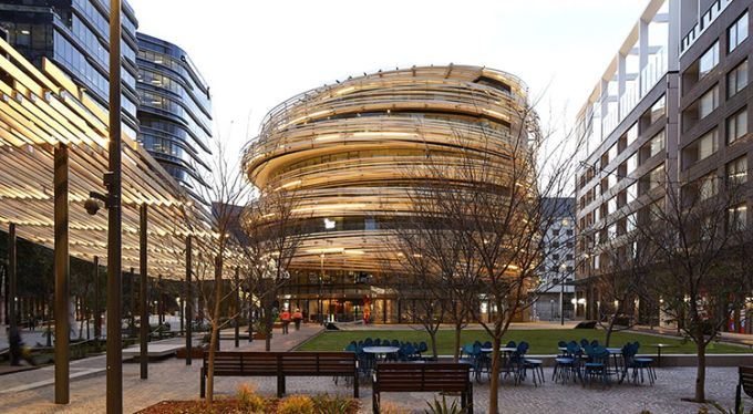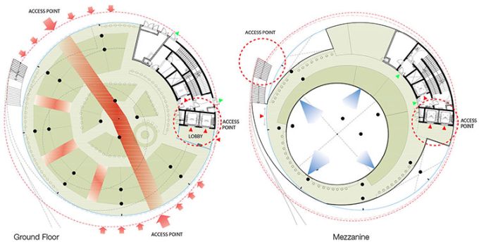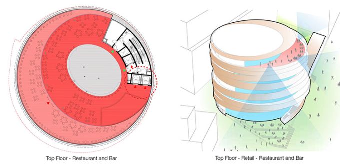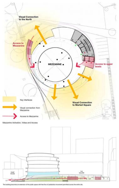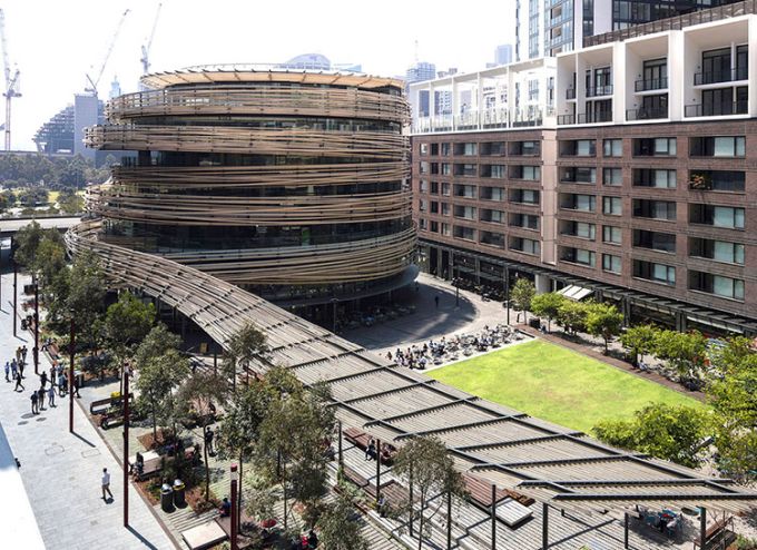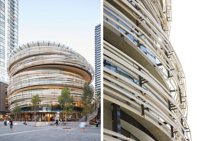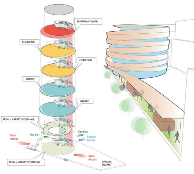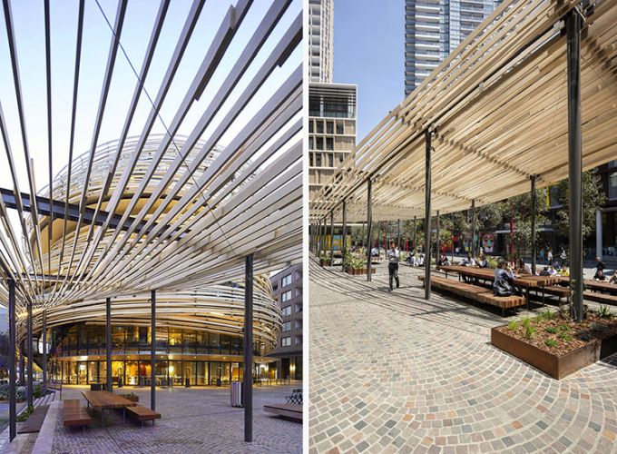 Kengo Kuma progetta la facciata curva in legno più grande d’Australia: 20 km di listelli in pino radiata acetilato che avvolgono il nuovo centro civico comunitario e lo collegano alla vivace piazza antistante. Indice degli argomenti: Un nido di legno Un edificio multidirezionale e permeabile Mix funzionale non gerarchico La piazza, il mercato e l’edificio Biblioteca del XXI secolo Centro per l’infanzia Vendita al dettaglio: Ristorante e bar La facciata curva in legno Un centro comunitario “in legno” situato a Darling Harbour, nel quartiere centrale di Sydney. L’obiettivo di Kengo Kuma era creare una struttura morbida e calda di pochi piani, integrata con la piazza ed in contrasto con il gruppo di grattacieli nell’area circostante. Il progetto va a riqualificare l’intera area circostante: gli schermi di vetro possono essere aperti nel mercato al piano terra per integrarsi con la comunità, e la facciata in legno a forma di spirale, avvolge l’edificio come una pelle e si estende ad abbracciare la piazza antistante, tramutandosi in un pergolato ombreggiante. Ai piani superiori, ogni piastra del pavimento è traslata di modo che i punti di vista mutino continuamente. Nominato “The Exchange“ questo progetto scultoreo in legno di Kengo Kuma & Associates (KKA) offre uno spazio pubblico dinamico e formale al contesto urbano di Sydney, in Australia. È un edificio civico multifunzione composto da una biblioteca pubblica, un centro per l’infanzia e usi commerciali (include un mercato, bar e ristoranti). Un nido di legno The Darling Exchange è caratterizzato dall’essere ricoperto da un’enorme guscio in legno: il complesso è intrecciato in pino radiata di origine neozelandese. Kuma si dichiara entusiasta del risultato finale: “I dettagli e le giunzioni sono così belli“. L’architetto giapponese elogia l’approccio aperto e informale della città ed è ottimista sul fatto che possa stabilire nuovi standard di design. “Sydney può mostrare un nuovo modello di stile di vita e un nuovo modello di stile di lavoro per una grande città“, dice. Kengo Kuma afferma che il Darling Exchange di Chinatown, che funge da biblioteca, centro per l’infanzia e dispone di bar e ristoranti, è strategico per la città. “È un punto di incontro di culture diverse. Abbiamo cercato di creare un tipo di punto di fusione fisico delle culture“. L’opera subisce l’influenza della tradizione giapponese, e va ad inserirsi all’interno di quel filone di ricerca portato avanti da Sou Fujimoto, Shigeru Ban, Toyo Ito che mostra un profondo rispetto per l’ambiente e il clima. “L’edificio tradizionale giapponese è una sorta di edificio sostenibile In ogni progetto rispettiamo ogni luogo e naturalmente troviamo una soluzione specifica“, specifica Kuma. Yuki Ikeguchi, capo progetto di Kengo Kuma & Associates, afferma che il legno è stato utilizzato in modo “giocoso”, simile al nido di un uccello. Un edificio multidirezionale The Darling Exchange è un edificio che supporta una vasta gamma di usi della comunità e del commercio al dettaglio. L’area di progetto è al centro del vivace quartiere di Darling Square Precinct, pullula di edifici, negozi al dettaglio e un flusso continuo di persone. Essendo al centro delle attività, è stata adottata una forma architettonica non direzionale. La forma circolare dell’edificio fornisce una struttura accessibile e riconoscibile da più direzioni. Pianta Darling Exchange Una forma geometrica unica è stata creata dallo spostamento dinamico delle piastre del pavimento creando terrazze esterne ad ogni livello che si adattano allo scopo e all’uso, rispondendo alle funzioni, alla qualità estetica e all’orientamento solare. L’architettura dell’edificio risponde alle particolari caratteristiche del contesto urbano da ogni direzione. La strategia dello studio delle volumetrie è stata quella di spostare le piastre del pavimento in modo che corrispondessero alle caratteristiche dell’uso adiacente. Il piano rialzato è accessibile direttamente dalla scala esterna. Sono disponibili ampie terrazze coperte con vista su The Square, lungo The Boulevard e verso nord su Tumbalong Park fino a Cockle Bay. Il piano superiore è un ristorante e bar con viste panoramiche sul porto e sulla città. Mix funzionale, non gerarchico, permeabile La forma circolare dell’edificio crea un accesso non direzionale e non gerarchico favorendo la permeabilità del Mercato Coperto al piano terra e il mix funzionale dell’edificio. Le scale nord portano le persone dalla piazza nord al mezzanino che estende la strada nell’edificio. The Darling Exchange concentra le funzioni di servizio sul lato orientale dell’edificio, lontano dagli spazi pubblici adiacenti. Ciò include le forniture di servizi agli edifici e l’uscita antincendio. L’ubicazione di questi servizi riduce il potenziale conflitto di usi tra l’edilizia civile e residenziale. L’accesso all’edificio avviene principalmente attraverso i due principali ascensori. Due scale antincendio forniscono le uscite di emergenza. L’edificio circolare risponde alla natura centrale, civica e punto di riferimento, attraverso: La necessità di più punti di accesso a sostegno della sua natura civica e degli usi comunitari; Un piano terra che è visivamente e fisicamente permeabile a livello, attivando il dominio pubblico; Visibilità lungo le linee chiave del sito che fornisce scorci della facciata dell’edificio unico e attira le persone nel distretto; Terrazze che attraversano l’edificio e ne espongono le qualità civiche La piazza, il mercato e l’edificio Il mercato coperto al piano terra ha una spina di circolazione che collega la terrazza nord alla piazza con la disposizione radiale delle bancarelle del mercato che orienta i dispositivi da nord a sud. Il layout della bancarella del mercato risponde al ritmo delle colonne strutturali e alla loro disposizione spaziale. Il principio del mer