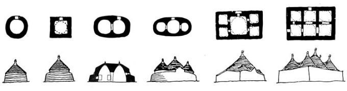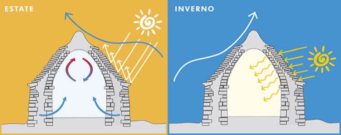 Il trullo pugliese, di origini antichissime, è uno straordinario esempio di architettura vernacolare italiana. Prodotto della cultura contadina, con pietra locale a basso costo, è la soluzione tecnica ed estetica alle esigenze climatiche tipiche del luogoIndice degli argomenti: Un’architettura spontanea, espressione della cultura contadina Storia dei trulli ed evoluzione La valle d’Itria o Murgia dei Trulli L’arte della tecnica costruttiva a secco Pseudocupola (cupola a sbalzo o falsa cupola) Principi di bioclimatica del trullo Pinnacoli e simbologia dei trulli Normative e prospettive di tutela dei trulli pugliesi Dopo aver visto un esempio di architettura vernacolare italiana (i Trabucchi o Trabocchi) icona delle coste abruzzesi e garganiche, oggi ci addentriamo nel cuore della Puglia per un viaggio alla scoperta dei celebri Trulli, fiabesche casupole in pietra dai tetti a forma di cono, che evocano tempi lontani, tinti di magia e mistero. Espressione della cultura contadina, di una civiltà remota basata sulla complicità atavica tra uomo e ambiente naturale in una simbiosi fatta d’istinto ed empatia, quando le leggi della natura erano le sole regole a cui obbedire. Patrimonio Unesco fin dal 1996, il trullo (in pugliese truddu, dal greco “tholos”, cupola) è una costruzione in pietra calcarea tipica della zona centrale della puglia (in dialetto casedda), realizzata con la stessa tecnica dei muri a secco (in dialetto parieti), senza ausilio di malta o cemento. Portati al centro del dibattito architettonico da Giuseppe Pagano e Daniel Guarniero, che hanno condotto una scrupolosa ricerca sul tema dell’abitare – confluita in una mostra fotografica esposta alla Triennale di Milano del 1936 e depositata nel libro-catalogo “Architettura rurale italiana” – attraverso un coinvolgimento diretto che li ha condotti tra paesi, città e campagne di tutta Italia. Essi indagano l’evoluzione della casa rurale italiana fin dalle primitive origini “non soltanto per il contributo spirituale ed estetico che ci può fornire una indagine sulla funzionalità della casa rurale, ma anche per affrontare con conoscenza più approfondita il problema pratico delle nuove costruzioni rurali che il Governo fascista sta progettando in tutta Italia. […] per dedurre da questa analisi la via logica per determinare la forma della casa colonica adatta ai nostri tempi, alle esigenze moderne, alla cultura storica del nostro Paese”. Trent’anni dopo, nel 1964, l’architetto austriaco Bernard Rudofsky, porterà all’attenzione globale il tema dell’architettura vernacolare con una mostra fotografica organizzata al Moma di New York, dal titolo “Primitive Architecture“ confluita poi nel catalogo Architecture without architects. Accanto alle numerose testimonianze di architettura spontanea sparse per il mondo (Stonehenge, capanne primitive in Asia e Africa, edifici in terra cruda, villaggi fortificati, case-palafitta, magazzini-fortezze, casegrotta della Cappadocia in Turchia, i Trabucchi del Gargano), fecero la loro comparsa anche i caratteristici Trulli di Alberobello. Un’architettura spontanea, espressione della cultura contadina Il trullo, da una parte rappresenta la memoria storica di un popolo, portatrice di valori, cultura e tradizioni; dall’altra è un modello che cela i segreti costruttivi più autentici, sapiente risultato del felice incontro tra uomo e natura attraverso 3 ingredienti espressione del genius loci: clima, materiale edilizio locale, ed economia agricola. Questo perché il vernacolo “non segue capricci né mode … si commisura alle dimensioni umane e ai bisogni umani, senza fronzoli, senza l’isteria del progettista…il semplice affidarsi a materiali edilizi locali garantisce il persistere di metodi costruttivi nobilitati nel tempo”. (B. Rudofsky) I trulli di Alberobello Costruzioni analoghe per forma, tecnica e materiali esistono in molte parti del globo, dai Pinnettas sardi, alle Pagliare molisane, ai Tucul africani, alle Tholoi micenee ma è specialmente in Puglia che si sono manifestate le condizioni ideali affinché il linguaggio architettonico sia evoluto dalla ruralità funzionale, verso un’estetica più raffinata e singolare, tale da essere considerata Patrimonio dell’Umanità. Storia dei trulli ed evoluzione Definiti dallo storico francese Emile Bertaux “costruzioni senza tempo”, i Trulli sono la manifestazione formale di un abitare intimamente legato al territorio, alla terra quale fonte di sostentamento, l’archetipo della cultura rurale pugliese dipendente dalla cura del podere, dall’agricoltura e dall’allevamento. Le fasi evolutive dell’architettura a trullo Il Trullo è la mirabile soluzione di un problema di economia agraria, rurale. Come ogni architettura, trae origine dalla primitiva necessità dell’uomo di ripararsi dalle intemperie, di avere un rifugio sicuro, basato sulla massima economia di spesa, fatica e tempo, offrendo al contadino una dimora che consente di rimanere a vivere con la famiglia sul terreno di lavoro. Anche se non mancano in Puglia, esemplari di architetture megalitiche come dolmen e menhir o resti di antiche civiltà Neolitiche, l’origine del trullo (casella in dialetto) può farsi risalire all’archetipo della capanna primitiva in legno e paglia poi evoluta nei tipici pajari in pietra pugliesi. Il più antico manufatto superstite di cui si conosce la data (1559: incisa sull’architrave) è il Trullo Marziolla in Valle d’Itria, poco distante da Locorotondo. Usato dai contadini che coltivavano i vigneti antistanti, è costruito in pietra a secco, di pianta circolare e si erge in altezza per 5,15 metri. Trullo Marziolla, Valle d’Itria, 1559. (contrada Marziolla, Locorotondo) Nonostante le variazioni formali più o meno decisive, esistono dei caratteri dominanti che identificano la tipologia architettonica o archetipo. Ad esempio, si possono rintracciare due tipologie di copertura: a tumulo (con ter