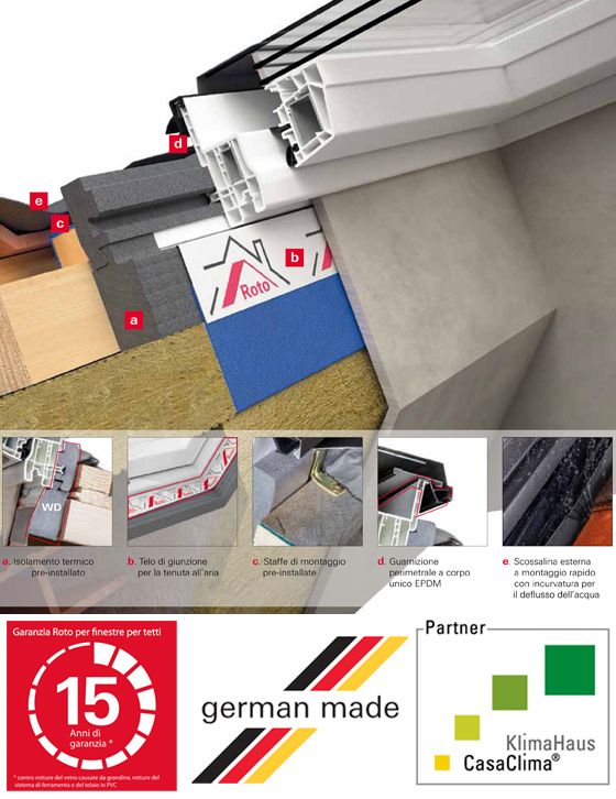 ROTO FRANK Il Sistema Finestre per tetti Circa 1.200 dipendenti in 2 stabilimenti di produzione e oltre 20 sedi commerciali in Europa. Con questi numeri Roto Tecnologia per tetti, una divisione del gruppo Roto, si annovera tra le imprese leader nella produzione di finestre per tetti e relativi accessori per una corretta protezione solare. Oltre 3.500 brevetti depositati sin dalla fondazione: qualità nei materiali, qualità nelle soluzioni proposte, qualità nel comfort d’uso. La tecnologia tedesca unita allo stile italiano. Tutto questo è Roto: la finestra per tetti. Storia Le pietre miliari Il successo del gruppo tedesco Roto Frank ha origine oltre 75 anni fa, con l’ideazione del primo sistema produttivo di ferramenta ad anta a ribalta per finestre a livello industriale. Con la successiva invenzione, la prima finestra per tetti con apertura a compasso, Roto acquisisce il proprio simbolo distintivo. Grazie all’esperienza maturata, Roto ha creato una gamma di prodotti altamente efficiente e performante all’insegna della migliore tradizione “german made”, collocandosi con prestigio all’apice delle classificazioni energetiche sia nazionali che internazionali. Nel tempo Roto si è trasformata da azienda individuale, in gruppo aziendale di livello mondiale dove tradizione, ricerca e innovazione rimangono i fattori portanti della propria produzione. Il principio Roto: Più libertà. Più Comfort. Più Libertà. Più Comfort: alla base del principio Roto figura un’accurata progettazione e un attento servizio personalizzato, dove al centro c’è sempre la persona. I prodotti dell’Azienda, dall’alto valore intrinseco, facilitano il lavoro di partner e clienti e si sintetizzano nella ricca scelta di soluzioni performanti, efficienti e a basso consumo energetico per un maggior comfort abitativo. Le 10 promesse di qualità garantita Roto In una abitazione il tetto/solaio e i serramenti sono responsabili per ca. il 30/40% della dispersione di energia: la scelta quindi di una finestra per tetti con caratteristiche performanti è determinante. La produzione Roto è già predisposta per assicurare la massima efficienza non solo secondo le normative nazionali bensì secondo standard energetici e certificazioni volontarie di importanza internazionale. Grazie all’esperienza maturata in oltre 70 anni di produzione, sviluppo e ricerca in Germania, Roto ha risposto prontamente alla sfida del mercato proponendo prodotti sempre più evoluti con una crescente attenzione verso soluzioni ad alta efficienza energetica ed isolamento acustico, per un vivere e un costruire sano, unendo design e la consolidata qualità “german made”. *15 anni di garanzia in caso di: – rottura del vetro per grandine – rottura della ferramenta – danni al telaio in PVCper ingiallimento e deformazione a seguito di forti sollecitazioni atmosferiche Qualità e know-how “germanmade” Oltre 70 anni di esperienza a fianco degli specialisti Prodotto da professionisti, venduto da professionisti e installato da professionisti Dalla produzione all’installazione: Più Libertà. Più Comfort Resistenza e manutenzione Controllo qualità certificato. Comfort garantito Facilità d’uso, comandi intelligenti, movimentazione confortevole, libertà senza fili grazie all’uso di sistemi radio per impianti domotici semplici e flessibili. Sicurezza Antisfondamento, vetro esterno temperato antigrandine, vetro esterno prolungato per un deflusso esterno dell’acqua, vetro interno di sicurezza stratificato, autopulente Aquaclear. Soluzione unica All-in-One Isolamento termico WD pre-installato, telo di giunzione per la tenuta all’aria, staffe di montaggio pre-installate, guarnizione perimetrale a corpo unico EPDM, scossalina esterna a montaggio rapido con incurvatura per il deflusso dell’acqua. Soluzioni ecosostenibili Le finestre in PVC non richiedono alcun tipo di manutenzione e offrono performance termico-acustiche d’eccellenza. Innovazione Designo Passaggi eleganti, linee fluenti, posizione agevole, verniciatura metallica e nessuna vite visibile dall’esterno. Finestra “sartoriale” su misura Le finestre Roto “SU MISURA” sono installabili in appoggio esterno e realizzabili in soli 8 gg. lavorativi. Non sono necessari interventi murari invasivi Tecnologia ecosostenibile e qualità premiata – 2010, Premio “Migliore Impresa Tedesca” – 2012, Primo “Diploma per il Costruire Ecosostenibile” e premio “KlimaHouse Trend 2012” come azienda operativa nel risparmio ed efficienza energetica per le aperture elettriche RotoTronic. – 2013, 3° posto al KlimaHouse Marketing Award per migliore comunicazione sullo stand – 2013, Partner CasaClima – 2014, 1° posto al KlimaHouse Marketing Award per migliore comunicazione sullo stand Certificazione CE sull’intera gamma Il marchio CE viene apposto a tutti i prodotti Roto in quanto conformi alle disposizioni della Comunità Europea. Dal febbraio 2010, prima di essere immesse sul mercato, le finestre per tetti che rientrano nell’ambito di applicazione UNI EN 14351-1, devono riportare il marchio CE. Scarica la brochure dedicata alle soluzioni Roto Consiglia questa azienda ai tuoi amici