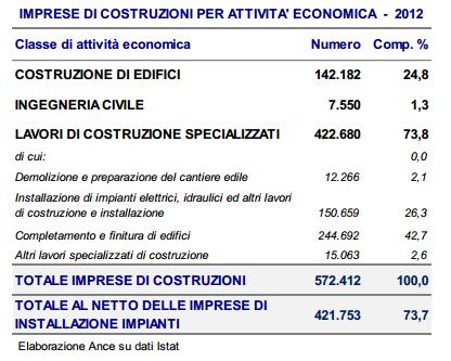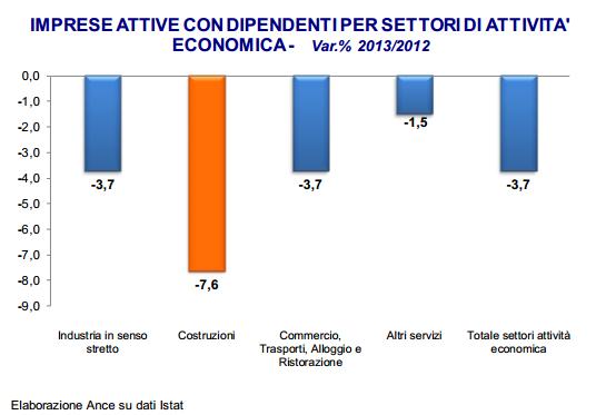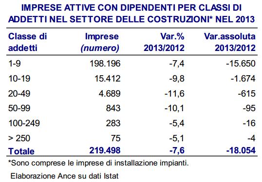 Il tessuto produttivo del settore delle costruzioni risulta sempre più ridimensionato a causa della crisi e i dati sulle imprese stimati dall’Istat per il 2013 lo confermano. Nel 2013, risultano 219.498 imprese attive con dipendenti operanti nel settore delle costruzioni, circa 18.000 in meno in un solo anno (-7,6% rispetto al 2012). Dal 2008 al 2013 nelle costruzioni sono uscite dal mercato circa 68.000 imprese con oltre un addetto. La contrazione registrata nel settore delle costruzioni nel 2013 (-7,6%) risulta essere la più elevata tra tutti i settori di attività economica: per l’industria in senso stretto la flessione è stata del 3,7%, nel settore del commercio, trasporti alloggio e ristorazione e negli altri servizi i cali si sono attestati, rispettivamente al 3,7% e all’1,5%. L’intero sistema economico ha registrato una riduzione del 3,7% rispetto al 2012. Il calo del numero di imprese con dipendenti nel settore delle costruzioni nel 2013 coinvolge tutte le classi di addetti ma con livelli di intensità particolarmente forti per le imprese con un numero di addetti compreso tra i 20 e i 49 addetti (-11,6%) e per la fascia 50-99 addetti (-10,1%). In un contesto generale di forte crisi settoriale, la significativa contrazione del numero di imprese con dipendenti operanti nelle costruzioni appare particolarmente preoccupante in quanto testimonia che il settore sta perdendo le realtà imprenditoriali più strutturate e dotate di un know-how specifico e consolidato nel tempo. Informazioni più complete sulla struttura delle imprese di costruzioni sono attualmente disponibili fino al 2012 e pertanto le analisi seguenti sono delimitate a tale anno. La struttura delle imprese di imprese di costruzioni nel 2012 In Italia, le imprese di costruzioni attive nel 2012 sono 572.412 e rappresentano il 12,9% del totale delle imprese operanti nell’intero sistema economico nazionale (circa 4,4 milioni di imprese), per un totale di 1.553.165 addetti. Il 73,8% delle imprese nel settore (circa 423mila) opera nei comparti di attività dei lavori di costruzione specializzati, quasi un quarto (142mila imprese) si occupa di costruzioni di edifici e l’1,3% di ingegneria civile (7.500). In particolare, se si esclude l’attività di “Installazione di Impianti Elettrici, Idraulici ed altri Lavori di Costruzione e Installazione”, nel 2012, le imprese di costruzioni risultano circa 422mila (il 73,7% del totale). Disarticolando le imprese operanti nel settore delle costruzioni nel 2012 per classi di addetti (572mila) emerge un tessuto produttivo fortemente frammentato: le imprese fino ad un addetto costituiscono la maggioranza (il 59,2%), mentre quelle con due o più addetti sono circa 233.000, pari al 40,8%. Nell’anno considerato la dimensione media delle imprese operanti nel settore nel 2012 si attesta al 2,7 addetti per impresa. La dinamica delle imprese di imprese di costruzioni nelle regioni nel periodo 2008-2012 Tra il 2008 ed il 2012 le costruzioni hanno sperimentato una notevole contrazione del tessuto produttivo, con una fuoriuscita dal sistema di circa 57.000 imprese che corrisponde ad un calo in termini percentuali del -9,1%. La forte contrazione del tessuto produttivo in atto nel settore delle costruzioni è generalizzato a tutto il territorio nazionale con tassi di flessione che oscillano tra il – 1,7% della Puglia al -13,9% dell’Emilia-Romagna. In termini assoluti la perdita più elevata si rileva in Lombardia, con più di 12.000 imprese uscite dal settore tra il 2008 e il 2012 (circa il 21% della perdita complessiva). L’aumento dei fallimenti La tenuta del tessuto imprenditoriale continua ad essere fortemente compromessa dalla grave crisi, che ormai da sette anni sta vivendo il settore delle costruzioni. L’indebolimento della struttura produttiva è ben evidenziato dall’aumento dei fallimenti nelle costruzioni, in progressiva crescita dal 2009. Secondo i dati di Cerved Group, le imprese di costruzioni entrate in procedura fallimentare sono passate da 2.152 nel 2009 a 3.119 nel 2013, con un aumento del 44,9%. La tendenza si conferma anche nei primi nove mesi del 2014 con un ulteriore aumento delle procedure fallimentari nelle costruzioni dell’11,8% nel confronto con lo stesso periodo dell’anno precedente (+11,9% i fallimenti nel complesso dell’economia). Complessivamente dal 2009 ai primi nove mesi del 2014 i fallimenti nelle costruzioni sono stati 15.833 su un totale di oltre 70 mila nell’insieme di tutti i settori economici. Pertanto il 22,4% dei fallimenti avvenuti in Italia riguardano le imprese di costruzioni. A livello geografico si confermano, tra il 2009 ed il 2013, situazioni di difficoltà su tutto il territorio nazionale. Nel Centro e nel Sud ed Isole si rilevano, nel periodo esaminato, aumenti rispettivamente del 56,9% e del 50,5% superiori rispetto alla media nazionale (-44,9%). Segue l’area del Nord-Ovest con +39,4% ed il Nord-Est che fa registrare un aumento dei fallimenti del 35,6% rispetto al 2009. Dall’analisi delle singole regioni per il periodo 2009-2013 emergono valori superiori al 50% in Toscana, Lazio, Molise, Campania e Sicilia. In forte aumento i fallimenti anche in Lombardia (+49,9%) ed in Emilia-Romagna (+47,3%) e nel resto del Paese con incrementi a due cifre, ad eccezione della Basilicata e Valle d’Aosta che manifestano segnali negativi. Il problema dei ritardati pagamenti dei lavori da parte della Pubblica Amministrazione e le difficili condizioni di accesso al credito per le imprese sono alcuni dei fattori che continuano ad incidere sul fenomeno dei fallimenti nelle costruzioni. Le costruzioni continuano ad essere, infatti, uno dei principali settori colpiti dal fenomeno dei ritardati pagamenti ed i tempi medi di pagamento si attestano sui sei mesi. I dati della Banca d’Italia, descrivono un progressivo disimpegno del sistema creditizio nei confronti delle costruzioni: tra il 2007 ed il 2013 i mutui erogati per investiment