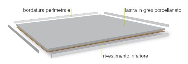 Il sistema è composto da lastre in gres porcellanato perfettamente squadrate e calibrate, cui viene applicato un rivestimento inferiore in sughero (un materiale naturale che accresce la resistenza allo scivolamento e risolve leggeri problemi di irregolarità del sottofondo) ed una bordatura perimetrale in ABS (con funzione anti-urto).