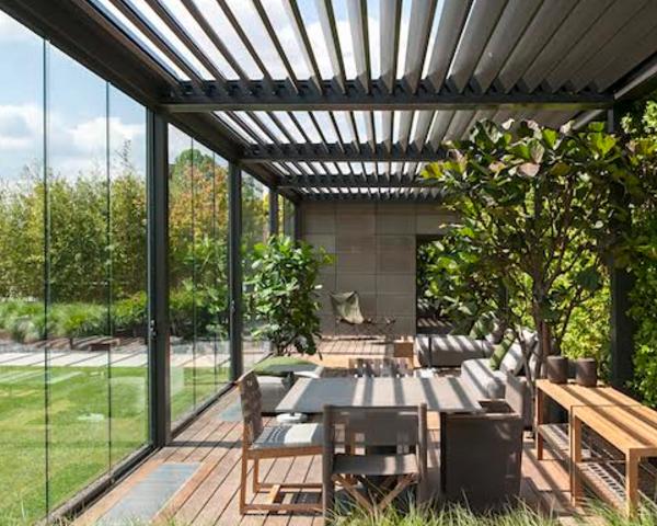 Con le pergole bioclimatiche di Pratic si possono vivere in maniera nuova spazi esterni come terrazze e giardini. Si può rendere impalpabile la differenza tra dentro e fuori? Frassinagodiciotto interpreta alla perfezione la funzione maestra della pergola Opera di Pratic, struttura che permette di elaborare gli spazi esterni al pari degli interni. Le lame in alluminio della struttura ruotano automaticamente di 140 gradi, permettendo il ricircolo naturale dell’aria e la regolazione della luminosità. Inoltre, in caso di maltempo, gli speciali sensori antipioggia azionano la chiusura completa delle lame, per la massima protezione. In ogni campata, l’inclinazione delle lame può avvenire separatamente, per la modulazione personalizzata di clima e luce in ogni settore. Non solo: la pavimentazione di Opera – realizzata in doghe di legno Ipè posato a correre, senza giunzioni a vista – cela un impianto di climatizzazione che d’inverno permette agli spazi di essere trasformati in una serra, mentre d’estate contribuisce al raffrescamento degli ambienti. Completano l’opera di schermatura e protezione le vetrate Slide Glass e le raffinate tende verticali Zip Raso, realizzate in tessuti filtranti e integrate nel profilo portante di soli 22 cm. Qui realizzata nella versione autoportante e verniciata in tinta grigia personalizzata – studiata da Frassinagodiciotto in stretto dialogo con Pratic – Opera si inserisce con eleganza nel contesto naturale e anche nella gradazione cromatica si accosta perfettamente ai colori scelti per la parte interna. La pergola ospita un’ampia area living, concepita dallo studio all’insegna dell’accoglienza e del relax, che prosegue con una zona meeting caratterizzata da un tavolo quadrato di grandi dimensioni, accorgimento che rende l’ambiente snello e dinamico. Come di consueto, anche in questo progetto Frassinagodiciotto ha rivolto particolare attenzione alla valorizzazione della vegetazione anche attraverso un sapiente e scenografico uso dell’illuminazione che, all’interno della pergola è affidata ai faretti Spot light posizionati sulle lame. Consiglia questo comunicato ai tuoi amici