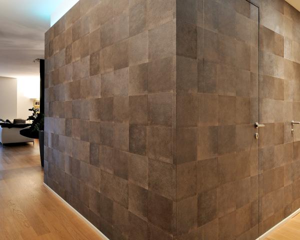 Il modulo in entrata è percorso da un pattern geometrico di quadrati, che si susseguono alternando calde nuance ispirate ai colori della terra. Per un look and feel indimenticabile, i pannelli delle soluzioni Scrigno sono personalizzati in modo unico, riprendendo l’effetto materico della carta da parati, per dar vita ad un continuum in cui le cornici, rasate con l’intonaco, sono sapientemente celate e i cardini, inseriti totalmente nel telaio, risultano invisibili.