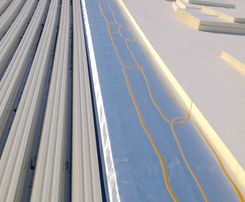 Innanzitutto è stato posato il raccordo al giunto strutturale FlamLine: un giunto di dilatazione per coperture impermeabili con movimento tridimensionale che permette di creare giunti in qualsiasi posizione, anche le più complesse, evitando in questo modo che l’impermeabilizzazione non si laceri in seguito ai movimenti strutturali. Resiste agli agenti chimici, agli acidi, ai solventi, s’incorpora nel manto e ne assicura la continuità.
