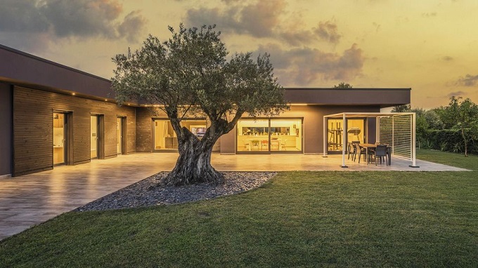 Le temperature risultano essere ideali in ogni stagione e, grazie all’installazione di pannelli fotovoltaici e alla dotazione di un impianto di raffrescamento, la casa gode di una totale autonomia energetica.Vista giardino della casa Rubner HausAll’esterno è possibile godere di uno splendido giardino nel quale spicca un prezioso ulivo di 250 anni, punto di partenza dal quale è stato sviluppato il progetto e sul quale si affacciano le varie stanze della casa.