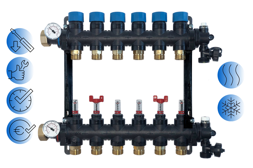 Immagina un collettore leggero ma robusto, completo e soprattutto ispezionabile senza necessità di fermare o svuotare l’impianto in caso di necessità. Un collettore adatto sia per gli impianti radianti in modalità riscaldamento che in modalità raffrescamento. Il collettore che hai sempre voluto ora c’è. È il nuovo Uponor Vario M.Uponor Vario M è stato sviluppato in modo innovativo per semplificare l’installazione e la manutenzione e aumentare la produttività in particolare negli edifici con tante unità e impianti complessi. Collettore Uponor Vario M: tutto in uno Il collettore Uponor Vario M è disponibile fino a 15 attacchi, viene fornito in funzione del progetto termotecnico del tuo impianto radiante con il grande vantaggio di poterlo utilizzare sia per riscaldamento che per raffrescamento. Uponor Vario M include i componenti fondamentali: i termometri montati sia in ingresso che in uscita dal collettore, i flussimetri per la regolazione della portata, le valvole montate sul tronco di ritorno, i blocchi sfiati aria e riempimenti. Con Uponor Vario M l’ispezionabilità diventa immediata e semplice: è possibile perfino sostituire/pulire il vetro del flussimetro isolando il singolo circuito radiante evitando così l’oneroso svuotamento – e successivo riempimento – dell’impianto. In questo modo si opera anche in modo responsabile rispetto alla risorsa d’acqua. I principali vantaggi: Collettore completamente ispezionabile Prodotto in poliammide Fornito completo di sfiati aria, carico e scarico impianto e termometri Componibile fino a 15 attacchi Connessione tubazioni ¾” eurocono Collegamento a baionetta per tutti i componenti Sostituzione dei vetri flussimetri senza fermo/svuotamento dell’impianto Include la chiave per la regolazione dei flussimetri Connessioni del collettore Uponor Vario M Connessione a baionetta per ingressi laterali 1” Gli ingressi laterali da 1” possono essere smontati/sostituiti semplicemente rimovendo la clip colorata: rossa nel tronco di mandata e azzurra nel tronco di ritorno. Nei moduli di ingresso/uscita è presente l’alloggiamento per i termometri che rilevano le temperature in modo accurato. Connessione a baionetta per uscite ¾” eurocono Hai già avvitato l’adattatore a compressione sul collettore ma hai nuovamente la necessità di svitarlo? Con Uponor Vario M puoi farlo semplicemente rimuovendo la clip nera posizionata sull’attacco da ¾”. Non occorre svitare il dado. Connessione a baionetta per corpo flussimetro Con Uponor Vario M sostituire o rimuovere il flussimetro diventa estremamente semplice e veloce. Puoi farlo in pochi secondi rimuovendo la clip. Non servono attrezzi. Connessione a baionetta per vetro flussimetro Mai più vetro sporco! Non visualizzi bene la portata sul flussimetro per lo sporco presente sul vetro? Con Uponor Vario M puoi pulire o sostituire il vetro del flussimetro senza svuotare l’impianto e risparmi tempo e spese. Consiglia questo comunicato ai tuoi amici