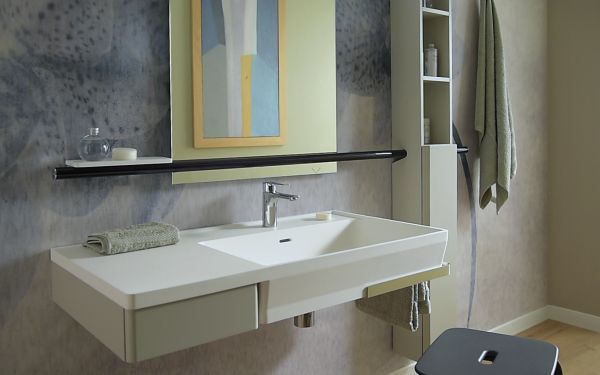Morphos, forma. Linee tenui disegnano le pareti ed offrono colore. Un concetto di arredo bagno dove funzionalità e sicurezza sono strettamente collegate.