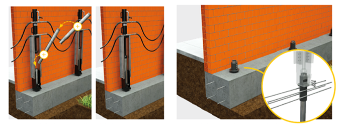 Nel frattempo sono state realizzate iniezioni di resine espandenti, finalizzate al miglioramento delle caratteristiche geomeccaniche dei primi tre metri di terreno sotto la fondazione, attraverso cannule di alluminio  inserite all’interno di micro perforazioni alla base del muro, senza ricorrere a opere di scavo e terminando il tutto in tempi molto rapidi.