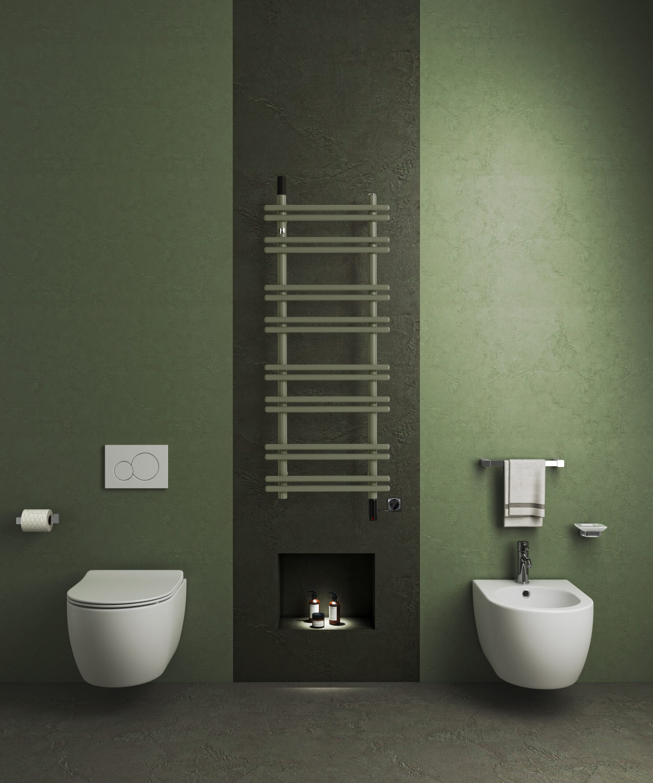 Interamente elettrico, Vulcano di Fiora ha il controllo digitale integrato. In più dimensioni e declinato nelle stesse finiture materiche della serie Celsius (Pizarra, Oak, Liso, Concrete, Lastra), per coerenza visiva e progettuale, è di Silexpol®, materiale brevettato composto da silicio e quarzo, riciclabile, idrorepellente, antibatterico e antimuffa grazie a nanotecnologie avanzate, e può essere dotato di porta-asciugamani opzionale.