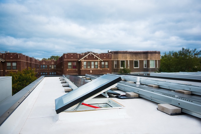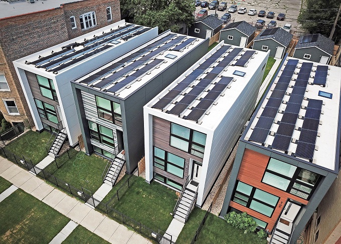 Ubicate nella Città del Vento, nella zona sud di Chicago, quattro residenze unifamiliari hanno scelto la qualità delle finestre da tetto FAKRO, caratterizzate da elevati standard in termini energetici e di sostenibilità ambientale. Il risultato? Un accesso sicuro al tetto e un’illuminazione degli ambienti sottostanti che dona comfort e benessere. Le residenze oggetto dell’intervento, situate nei pressi del Washington Park, fanno parte di un ambizioso progetto di recupero e riqualificazione di edifici residenziali abbandonati attivo da tempo a Chicago. Si tratta di un complesso di edifici che si distingue sia per l’immagine sobria e piacevole delle architetture che per i notevoli standard di efficienza conseguiti. A tale proposito le residenze sono in attesa della certificazione LEED rating Platinum. Grazie all’installazione di moduli fotovoltaici sull’ampio tetto piano le residenze sono riuscite a conseguire l’autonomia energetica alimentando le utenze domestiche e gli impianti di climatizzazione con significativi risparmi economici e annullamento delle emissioni in atmosfera di sostanze inquinanti. Il contributo delle finestre da tetto FAKRO Per garantire un’adeguata illuminazione naturale degli spazi interni e l’accesso al tetto per la manutenzione dei moduli fotovoltaici e la pulizia degli stessi sono stati installati in copertura eleganti lucernari DRF FAKRO.Queste soluzioni garantiscono la massima tenuta agli agenti atmosferici ed elevate prestazioni in termini di dispersione termica e tenuta all’aria, oltre a garantire l’illuminazione degli spazi sottostanti con un incremento della vivibilità e del comfort. I lucernari per tetti piatti FAKRO DRF assicurano il massimo apporto di luce naturale agli spazi interni sottostanti e rendono agevole e sicuro l’accesso alle coperture piane con pendenza da 2° a 15°; inoltre, grazie al doppio vetrocamera DU6 e ai profili riempiti con materiale termoisolante raggiungono una trasmittanza termica pari a Uw=0,74 W/m²K e performance acustiche pari a Rw=38 dB. La movimentazione del battente avviene grazie alla dotazione di speciali cerniere che consentono la rotazione fino a 80° e ad un funzionale sistema a pistoni che riduce lo sforzo e mantiene l’anta in posizione aperta, evitandone la chiusura accidentale. Non sono da trascurare, poi, i particolari inserti antiscivolo del telaio che assicurano la massima sicurezza d’uso. Consiglia questo comunicato ai tuoi amici