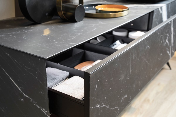 Geromin lancia Eclipse, la nuova collezione di arredi per il bagno caratterizzata da eleganza e raffinatezza; proprietà espresse dalle superfici realizzate con un particolare vetro che riproduce le venature del marmo. A cura di Fabiana Murgia Indice: Eclipse effetto marmo by Geromin Geromin coordina l’arredo del bagno Quando si parla di marmo è facile pensare all’esclusività e alla raffinatezza che questa pietra riesce a donare agli ambienti nei quali viene utilizzata. Il marmo si contraddistingue, infatti, per il valore unico e inimitabile, un valore che nessun altro materiale possiede. Eclipse effetto marmo by Geromin Con la linea Eclipse proposta da Geromin è possibile rivestire l’arredo bagno donando eleganza all’ambiente grazie alla particolare superficie vitrea che riproduce le venature del marmo. Una linea nuova sviluppata da Geromin che, come di consuetudine, offre l’opportunità al cliente di personalizzare la soluzione grazie alla proposta dei toni chiari del Bianco Calacatta e di quelli scuri del Nero Marquina, soddisfacendo ogni esigenza.Grazie alla finitura marmorea che caratterizza Eclipse la schiena dei moduli a giorno viene impreziosita donando all’ambiente un aspetto ricercato; inoltre l’eleganza delle venature ottenute nella finitura black&white può essere ulteriormente esaltata mediante la dotazione di accessori metallizzati che generano contrasti materici e cromatici, conferendo al bagno un carattere deciso. L’eleganza che rende unici i complementi d’arredo Eclipse è ottenuta grazie alla ricercatezza dei dettagli,ricercatezza che si inserisce armoniosamente negli spazi del bagno e che viene sottolineata dalla presenza di rivestimento chiaro o scuro negli interni dell’arredo e di apertura push-pull; saltano subito all’occhio anche i piedini in metallo nero antracite, che enfatizzano lo stile raffinato, e l’innovativa specchiera on-off incorniciata in una finitura d’acciaio e caratterizzata da regolazione d’intensità, per donare un’atmosfera intima e rilassante al bagno senza trascurare la funzionalità. Geromin coordina l’arredo del bagno Il vetro effetto marmo Eclipse non dona eleganza solamente al mobile, ma estende la bellezza del marmo ad altri arredi, come il pensile, e lo fa grazie a uno stile black&white di grande tendenza che può essere valorizzato con l’ausilio di accessori metallizzati che contribuiscono ad arredare l’ambiente con grande personalità.Gli elementi che compongono la rubinetteria si mostrano, invece, nella tonalità del rosa generando un abbinamento perfetto con la finitura materica Bianco Calacatta o Nero Marquina. Queste finiture sono coordinabili al rivestimento della vasca Rio di Hafro per dare forma a un bagno dallo stile unico e armonioso. Consiglia questo comunicato ai tuoi amici