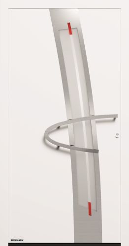 Il modello ThermoSafe (Motivo 552) è pensato per case moderne e di design, grazie al dinamismo della maniglia e delle decorazioni in acciaio inox. Inoltre personalizzano la proposta il vetro decorativo Float opaco con strisce trasparenti e la pellicola rossa. Questa chiusura ha un valore di trasmittanza termica fino a 0,87 W/(m²xK).