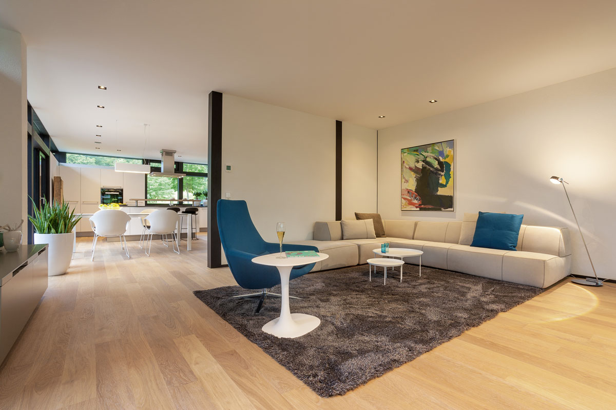 Grazie a queste caratteristiche, il cliente ha la massima libertà nella personalizzazione di una casa prefabbricata modum: con spazi interni generosi, finestre a tutt'altezza e uno spazio di vita aperto a sottolineare l'inconfondibile architettura a graticcio senza tempo in legno e vetro di HUF HAUS.