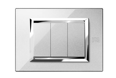 Nelle placche in vetro e alluminio una cornice cromata disegna il profilo del punto luce e si coordina con la cornice interna.