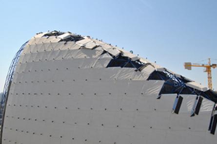 Il primo passo nella costruzione del sistema impermeabile è stato la predisposizione a piè d'opera dei singoli moduli (dimensione 2,5 x 2,5 metri) così costituiti:1. Due barelle di supporto di acciaio disposte con la giusta angolazione grazie ad una macchina a controllo numerico;2. Una lamiera grecata tagliata a disegno, posata e fissata sulle barelle;3. Uno strato di barriera al vapore costituito dalla membrana autoadesiva Sopravap Alu Stick;4. Un doppio pannello di materiale termoisolante in lana minerale fissato alla lamiera con apposite viti e placchette;5. Manto impermeabile in poliolefine flessibili armato con rete di poliestere FLAGON EP-PR da 2,0 mm fissato meccanicamente al supporto metallico lungo il perimetro.Dopo questa fase di prefabbricazione, il modulo è stato successivamente sollevato in copertura procedendo poi alle differenti lavorazioni in quota:- fissaggio dei vertici di ogni modulo ai nodi della struttura reticolare portante- posizionamento delle lamiere integrative tra i vari moduli- completamento della barriera al vapore e dell'isolamento termico - termosaldatura del manto in poliolefine flessibili FLAGON EP-PRInoltre alla fine è stata eseguita la saldatura dei raccordi prefabbricati in FLAGON TPO necessari a impermeabilizzare gli elementi di sostegno della copertura finale, realizzata in lastre di GFRC (Glass Fiber Reinforced Concrete), che attraversano tutta la stratigrafia compreso il manto impermeabile in poliolefina FLAG Spa.