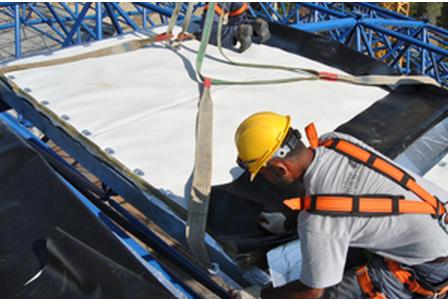 La posa in opera è stata effettuata, in soli 40 giorni di lavoro, dalla società Tecnosimper di Sedriano (MI). La stratigrafia tecnica prescelta fa sì che lo strato di zavorramento fisso assolva a due fondamentali funzioni: in primo luogo protegge dai danneggiamenti meccanici accidentali il manto sintetico impermeabile e, in secondo luogo mantiene in opera il sistema impermeabile in contrasto all’azione del vento. Posato in modo indipendente dal supporto, il manto Flagon in poliolefina modificata è dotato d’inserto di velo di vetro per garantire la maggior stabilità dimensionale.