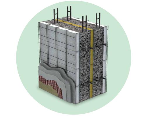 L’idea alla base del sistema di questa edilizia industrializzata è che la funzione isolante debba essere integrata nella muratura in fase di realizzazione e non applicata in opera come previsto dal sistema a cappotto tradizionale.