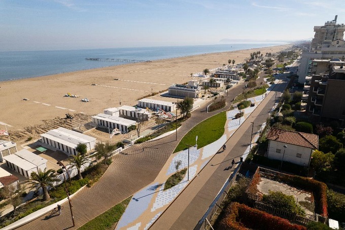 La pavimentazione drenante IPM GeoDrena® è stata scelta per il progetto di riqualificazione del nuovo Parco del Mare di Rimini. Per questo progetto IPM Italia, in qualità di partner consulenziale e tecnico, si è occupata di ogni cosa: dalla scelta della pavimentazione, alla configurazione del giusto sistema, fino alla posa e alla messa in opera.IPM GeoDrena® è il sistema di pavimentazione continua eco-friendly dalle proprietà ultra-drenanti, che si integra con il territorio e gli elementi di arredo urbano. Grazie alle sue caratteristiche, questa pavimentazione si è dimostrata perfetta per la realizzazione del progetto di riqualificazione del lungomare riminese nel quale prendono forma aree verdi, aree dedicate allo sport, piste ciclabili e pedonali, palestre a cielo aperto, foreste del mare e alberi-fontana ispirati a Gianni Rodari. Il progetto del Parco del Mare di Rimini La riqualificazione del lungomare di Rimini è un esempio concreto di sistema di rigenerazione urbana complesso, capace di cambiare per adattarsi alle nuove esigenze di residenti e turisti. L’obiettivo, quindi, non consiste solamente nel realizzare un waterfront migliorato nell’estetica, ma che sia anche più funzionale per sport, tempo libero, infanzia e socialità.Per poter raggiungere tali obiettivi è stata fondamentale la scelta della giusta pavimentazione. Per questo motivo IPM Italia, uno dei maggiori player nazionali nella produzione e posa di pavimenti continui in resina, è stata scelta per collaborare prima con l’Amministrazione Comunale e lo Studio di progettazione Benedetta Tagliabue, e poi con CBR e Impresa Mattei Srl, le due imprese edili affidatarie del cantiere. IPM Italia è stata coinvolta sin dagli esordi nel progetto di riqualificazione, a partire dalla definizione del sistema di pavimentazione per esterno più adatto. Questa collaborazione ha permesso di individuare la giusta pavimentazione drenante che ha funzionato come elemento migliorativo del progetto integrandosi perfettamente con gli arredi urbani e gli spazi a verde. Il sistema di rivestimento IPM GeoDrena nel progetto Il sistema di rivestimento IPM GeoDrena® ha permesso di coprire i 5000 mq di cantiere dei due primi lotti, che comprendono il lungomare Tintori e il Lungomare Spadazzi. Questa pavimentazione traspirante e ultra drenante permette di drenare ben 2.700 lt/mq/minuto; inoltre, si tratta di una pavimentazione eco-friendly e, grazie alla varietà e combinazione di colori delle graniglie naturali di pregio, capace di integrarsi perfettamente in qualsiasi spazio outdoor. Per il lungomare sono stati miscelati sabbia del Ticino e quarzi in diverse granulometrie che hanno permesso la realizzazione delle diverse campiture previste per il sardoncino, elemento decorativo e simbolico di Rimini. Ma cosa vuol dire eco-friendly? Grazie alle proprietà drenati, la pavimentazione permette di utilizzare l’acqua piovana per irrorare le aree verdi circostanti in ottica di circolarità, risparmio di risorse e costi. Il materiale drenante permette, infatti, all’acqua di defluire attraverso la sua struttura porosa, eliminando così il fenomeno del ruscellamento e i ristagni ed evitando che la superficie risulti scivolosa. La struttura aperta, inoltre, permette il naturale ricircolo dell’aria minimizzando l’accumulo di calore sulla superficie rispetto ai più tradizionali rivestimenti per esterni. Ma non è tutto. La composizione di questo pavimento è ottenuta preparando inerti naturali miscelati in cantiere con un legante eco-compatibile di formulazione dell’azienda a zero emissioni VOC. Consiglia questo comunicato ai tuoi amici