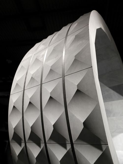 Il materiale scelto per Stone Gate è il Bardiglio nuvolato, un litotipo compatto di colore grigio scuro con sottili venature bianco-grigio. Il colore di questo marmo è particolarmente apprezzato per applicazioni in ambito artistico, architettonico e per l’arredo urbano. La firma estetica e tecnologica di Lithos Design è evidente anche sulla superficie esterna di Stone Gate: i conci di Bardiglio nuvolato sono, infatti, finemente decorati su un lato con una texture ornamentale tridimensionale appositamente progettata per garantire una resa estetica perfetta e dal forte impatto scenico.