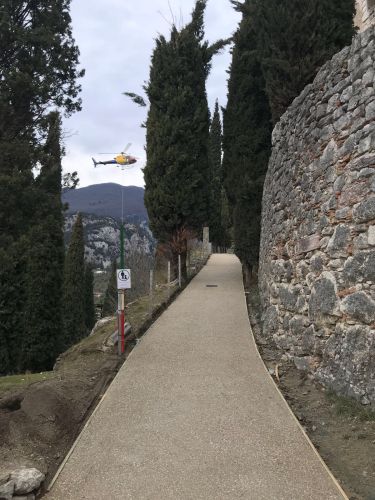 Il Comune di Arco di Trento ha completato la ripavimentazione del tratto di passeggiata panoramica, precedentemente ricoperto di ghiaia, che porta al Castello medievale, attraverso decine di ulivi.