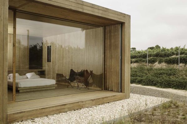 Gli interni del Refugio en la Viña nei pressi di Valencia: legno e colori coerenti con la natura