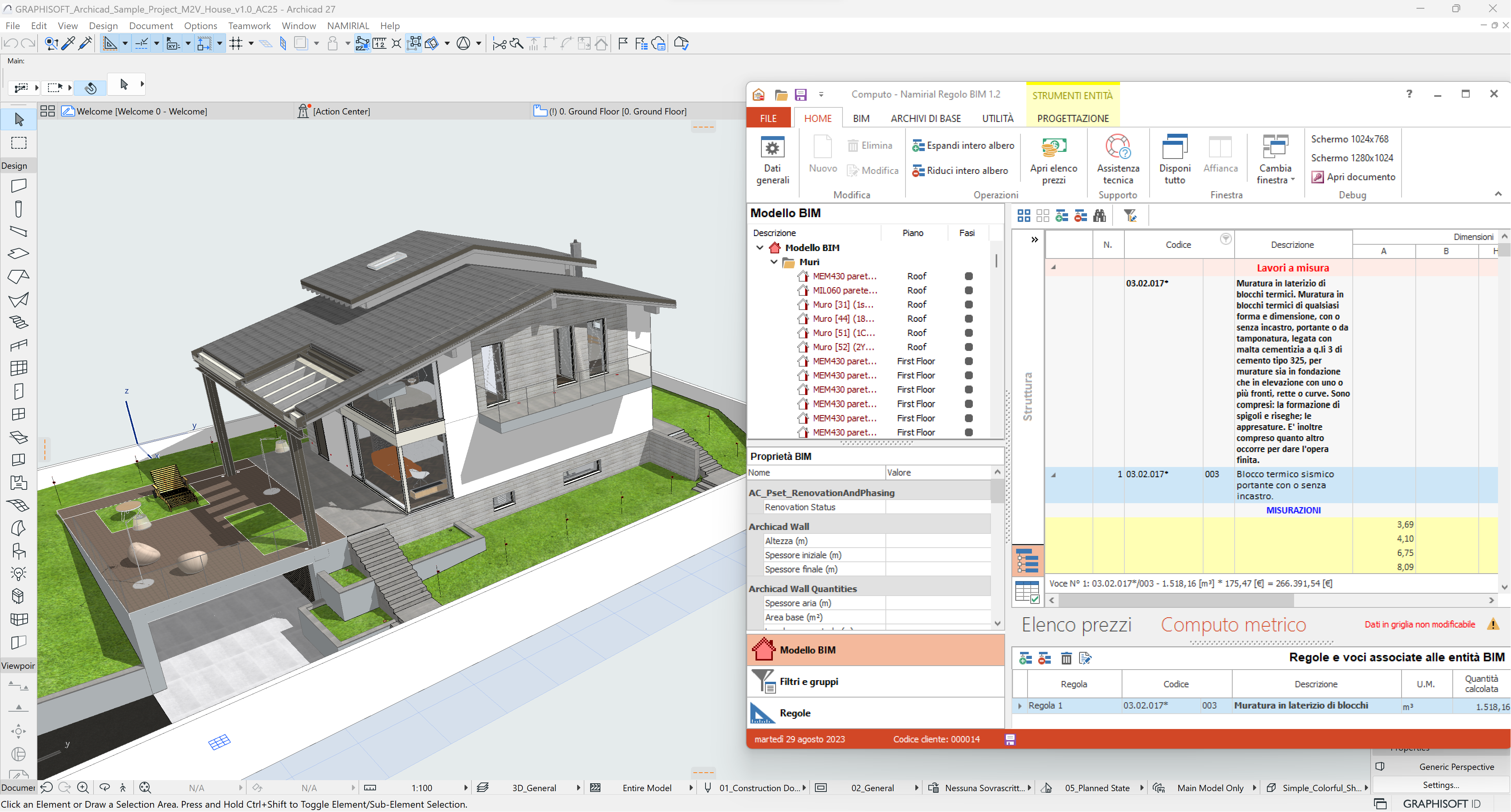 Namirial BIM eredita molte delle funzionalità di Archicad, uno dei software BIM più diffusi a livello internazionale, garantendo un’interfaccia familiare per gli utenti esperti del settore. Il programma consente di lavorare con strumenti parametrici avanzati che permettono di generare modelli 3D ricchi di informazioni geometriche e materiali, che poi vengono automaticamente elaborati per il computo metrico.