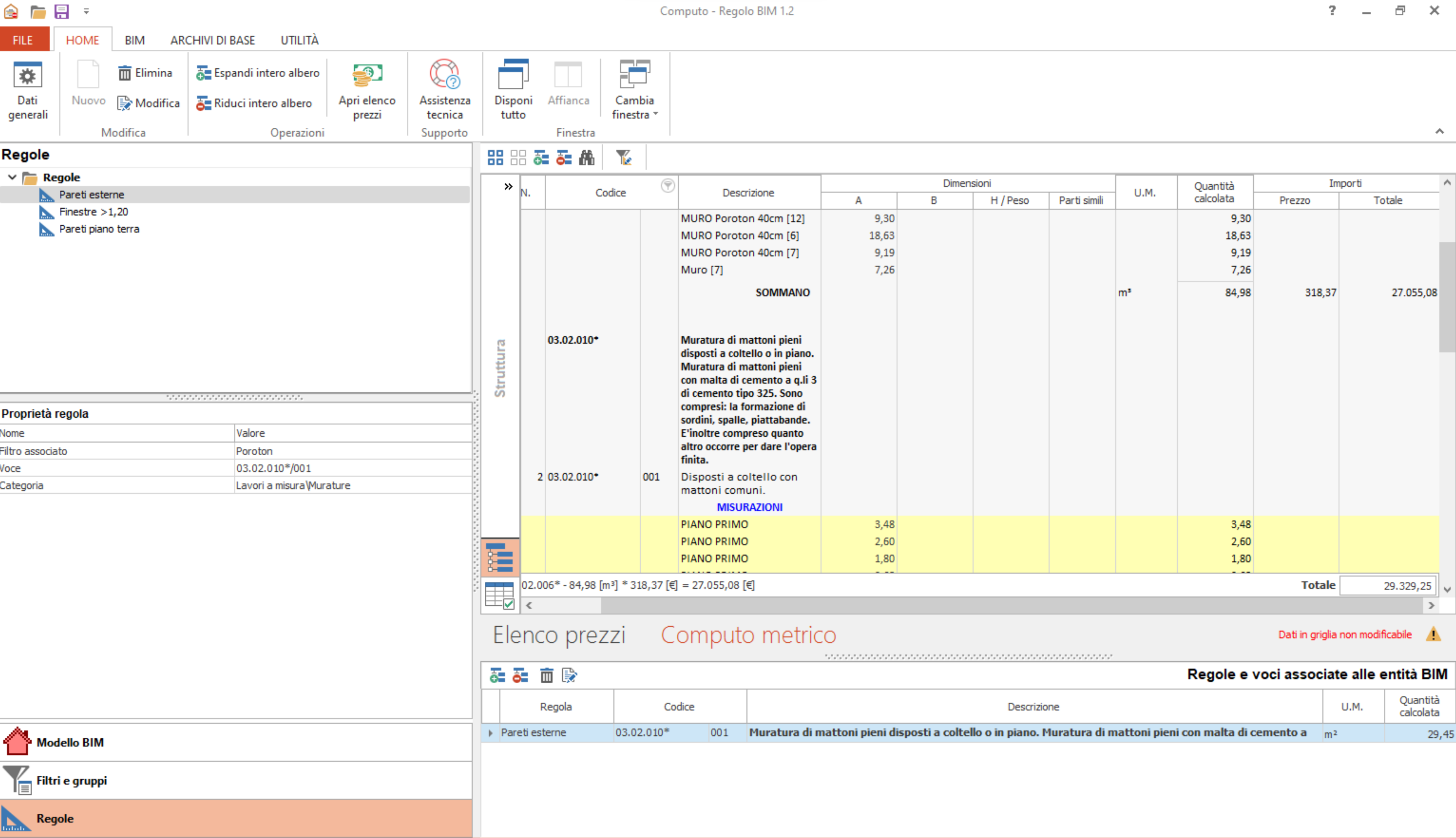 Una delle caratteristiche più innovative di Namirial BIM è la possibilità di ottenere computi metrici dinamici direttamente dal modello digitale. Grazie all’add-on Regolo, il software è in grado di estrarre automaticamente quantità e materiali dagli elementi del modello, facilitando la redazione del computo metrico senza necessità di inserimenti manuali.