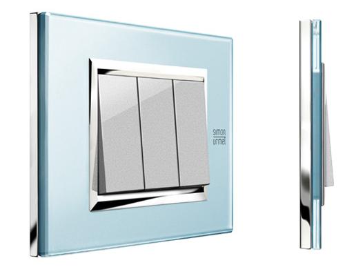 Nelle placche in vetro e alluminio una cornice cromata disegna il profilo del punto luce e si coordina con la cornice interna.