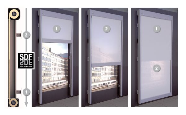 MURALTO DS6200 una innovativa tenda a scorrimento verticale multifunzionale, con tecnologia SDF (Dual Function). Due diversi tessuti integrati in un solo sistema, che scorrono su guide laterali tramite sistema SIR. Un sistema e due vantaggi quindi, grazie alla combinazione vista verso l’esterno e ombreggiamento oppure vista verso l’esterno ed oscuramento.