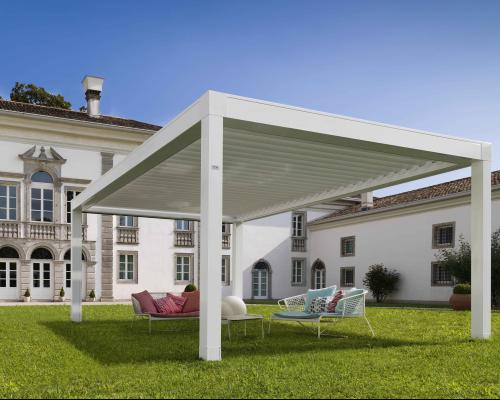 Opera presenta un design lineare ed elegante, è realizzata in alluminio e la sua copertura è composta da lame frangisole ruotabili fino a 140° per regolare luce e circolazione dell’aria.