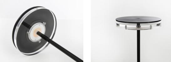 La luce nasce dall'intersezione fra un raffinato disco e una sottile asta verticale, ancorata a una base minimal ma dai materiali preziosi e dalla finitura in ottone stonewashed.