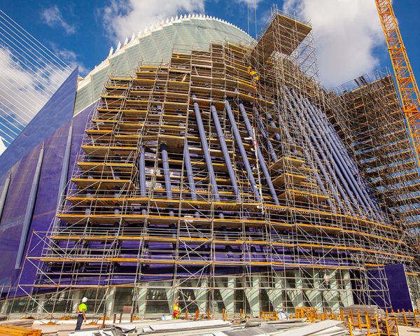 ULMA ha partecipato al progetto di ristrutturazione del Palazzo Agora, situato nella Città delle Arti e delle Scienze di Valencia, futuristica struttura progettata da Santiago Calatrava Agora è un bellissimo edificio multifunzionale realizzato a Valencia dall’architetto e ingegnere Santiago Calatrava, che fa parte del complesso “Città delle Arti e delle Scienze”. Si tratta di una struttura concepita come una grande piazza coperta, completamente traslucida, in cui l’architettura, a forma di ellisse con estremità appuntite, che nelle intenzioni di Calatrava vuole ricordare due mani intrecciate, permette la miglior illuminazione naturale. Con dimensioni di 100 x 65 m e un’altezza di 68 m, le doghe centrali raggiungono un’altezza di 85 m. L’elemento più caratteristico dell’edificio è un tetto mobile, o “brise-soleil”, realizzato con 163 lamelle in metallo che misurano 31 m in altezza al centro dell’edificio, e 15 m alle estremità inferiori. ULMA è stata scelta, come unico fornitore, per le soluzioni di ponteggio di un cantiere tanto complesso, considerando la forma ellittica e i cambiamenti di pendenza a diverse altezze. In particolare per l’intervento di copertura dell’intero edificio, più di 4.247 m2 di spazio, è stato utilizzato il sistema multidirezionale BRIO per la sua ristrutturazione. Ulma ha accettato e vinto la sfida, grazie alle proprie soluzioni: Estremità a Nord e Sud: area di superficie 1000 m2, altezza massima 33m. Soluzione: ponteggio perimetrale BRIO con elementi a sbalzo di 1 m in appoggio all’arco dell’edificio. Quattro Fasi Centrali: area di superficie 2600 m2, altezza massima 48m. Soluzione: Ponteggio perimetrale BRIO con elementi a sbalzo che si estendono fino a 3 m. I puntelli di stabilizzazione sono stati sistemati con precisione, e il ponteggio adattato perfettamente per la curvatura dell’edificio. Per progettare il ponteggio di questo cantiere tanto complesso ULMA ha utilizzato la tecnologia BIM. Grazie alle informazioni fornite dai modelli 3D sono state fatte dall’azienda le scelte migliori in ogni fase del progetto: la pianificazione, l’esecuzione, e l’utilizzo della struttura del ponteggio per tutto il progetto, inclusa la sua manutenzione post-assemblaggio. La tecnologia BIM ha fornito una sintesi dettagliata di tutte le informazioni più importanti dell’intervento, permettendo di avere strategie di gestione complete a disposizione di tutte le parti. Il risultato è efficenza e precisione aerodinamica. Palazzo Agora di Valencia dall’interno Scale di accesso e piattaforme strutturali per lo stoccaggio dei materiali e gli ascensori di servizio sono stati installati su entrambi i lati dell’edificio, semplificando la gestione del progetto e aumentando l’efficienza. Consiglia questo comunicato ai tuoi amici