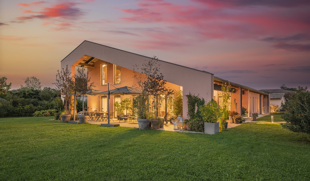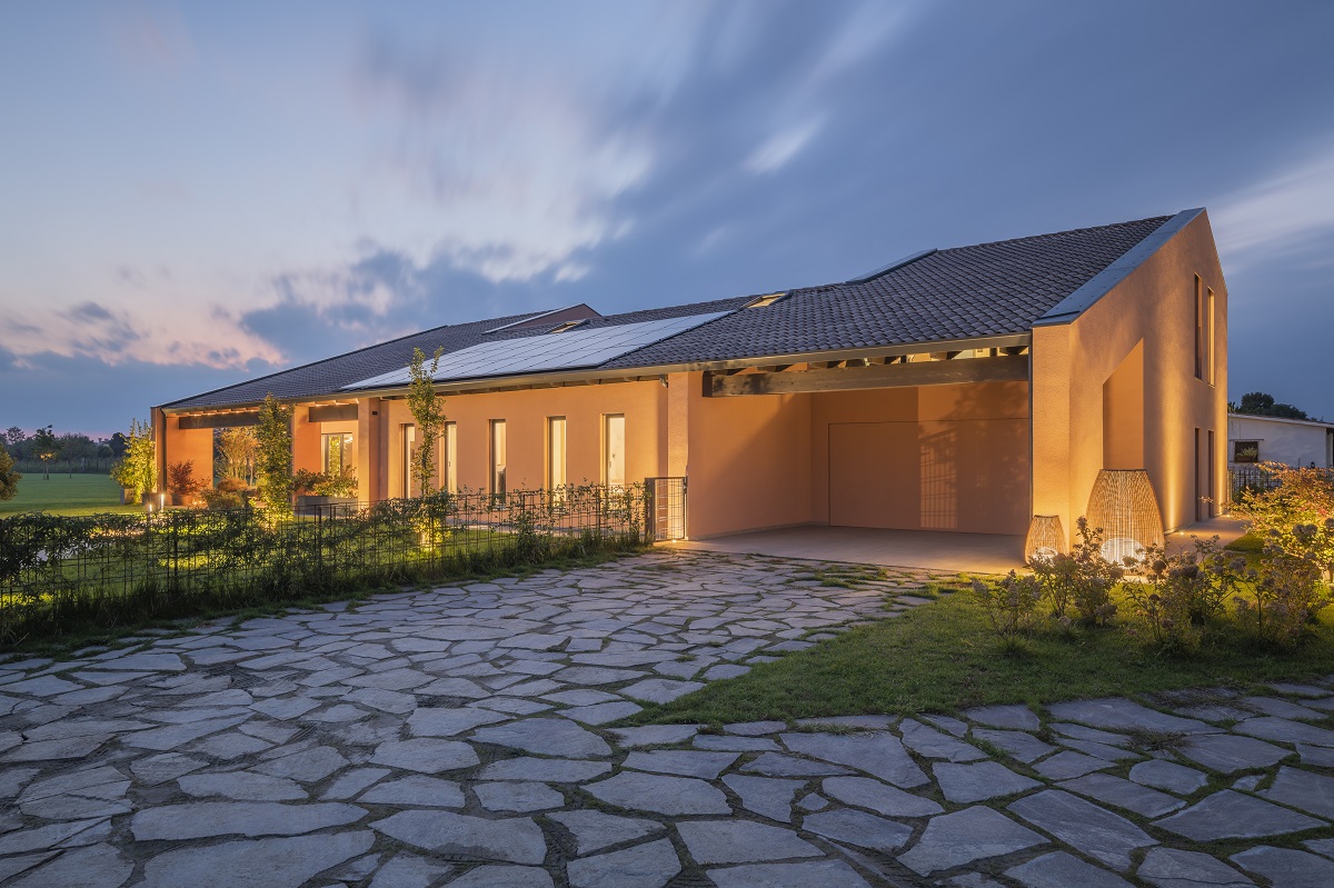 La camera padronale, dotata di bagno privato e ampia cabina armadio, presenta in prossimità della testata del letto una quinta scenica ricoperta da un’altra carta di Glamora dai toni neutri e dal disegno rilassante; anche le camere dei tre figli sono matrimoniali e complete di bagno.Vista da fuoriLa casa contiene un’area a cui si accede solo dall’esterno, tutta dedicata ai ragazzi: una stanza del cinema, con una piccola palestra, il bagno e un angolo cottura. A completare il tutto un portico importante, esposto a sud e vissuto come un salotto.