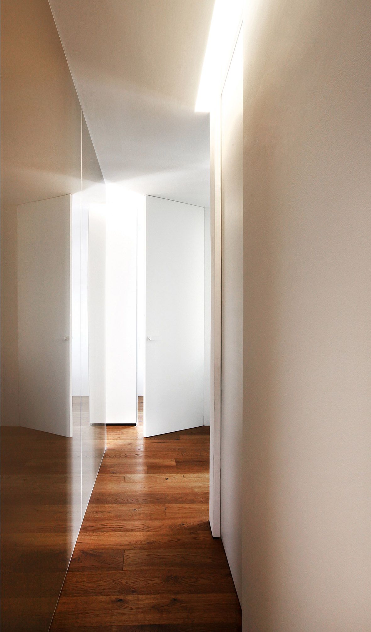 Queste porte sobrie ed eleganti sono disponibili in due modelli: Prima, versione con anta liscia, e Sound, impreziosita da due inserti orizzontali in acciaio satinato.