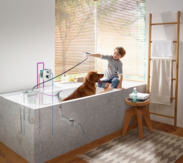 Il montaggio è semplice, rapido e privo di pericoli. Il kit di installazione mette a disposizione dei clienti i seguenti elementi: un segnaposto di cartone per riprodurre lo spazio libero sotto la vasca da bagno o le piastrelle, un coperchio per l’intonaco quale segnaposto per il telaio di montaggio, un tubo flessibile di collegamento per la connessione al tubo dell’acqua, un supporto per il tubo flessibile e un vano di accesso per il lavaggio del tubo.