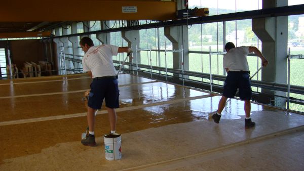 Per la realizzazione dello strato di ripristino i posatori hanno dapprima levigato il rivestimento esistente fino al substrato di cemento e successivamente lo hanno preparato per il nuovo intervento. Le riparazioni puntuali sono state effettuate con la malta di riparazione Triflex, prima che i dettagli fossero impermeabilizzati con l’impego del sistema Triflex ProDetail.