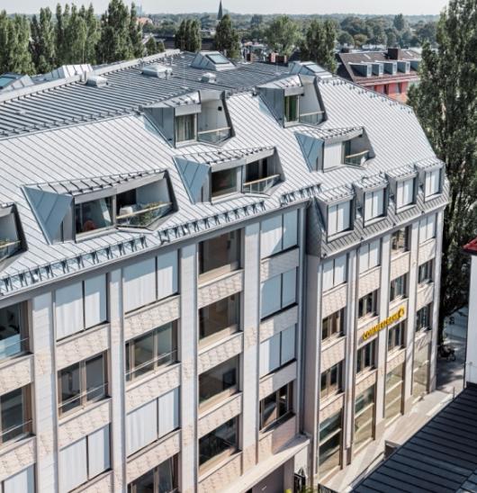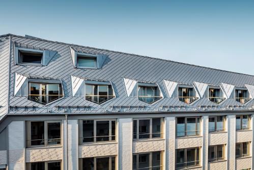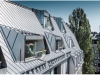 Esclusiva realizzazione di un tetto che crea nuovi spazi abitativi reinterpretando la tradizionale copertura a padiglione dei palazzi storici del quartiere di Schwabing, con i rivestimenti PREFA. Sotto l’ampia copertura di un edificio residenziale e commerciale situato nelle immediate vicinanze del parco di Schwabing, a Monaco, sono stati realizzati appartamenti mansardati che vantano generosi locali open space. Il tetto a padiglione, elemento classico dei palazzi storici di Monaco di Baviera, è stato reinterpretato aprendo ampie logge e finestre nel tetto. Per il rivestimento della copertura nella zona mansardata sono state scelte le Scaglie in alluminio PREFA, mentre le superfici piane sono state rivestite con Falzonal in doppia aggraffatura, entrambi i sistemi valorizzano il tetto dal punto di vista estetico e funzionale. Tetto a padiglione tipico di Schwabing reinterpretato con PREFA La riqualificazione dei centri storici è la specializzazione degli architetti Oliver Noak e Andreas Müsseler dello studio di architettura Meili, Peter GmbH. “La necessità di preservare il paesaggio urbano nonostante la realizzazione di spazi abitativi generosi implica grandi responsabilità e rappresenta una grande sfida, soprattutto in zone esclusive come la Leopoldstraße”, spiegano i due progettisti, che per vincere questa sfida, hanno tratto ispirazione dalla forma originale del tradizionale tetto a padiglione dell’architettura bavarese di fine Ottocento. Alla ricerca di un tocco moderno L’originale forma del tetto ha spinto gli architetti ad affrontare sfide tecniche fuori dal comune. “Il nostro obiettivo era quello di creare una copertura omogenea, robusta e che richiedesse poca manutenzione, in grado di uniformare le diverse pendenze, superfici e aperture. Così sono nati appartamenti spaziosi e pieni di personalità. Gli interni dell’edificio si fondono in modo simbiotico con il rivestimento esterno del tetto”, spiega Andreas Müsseler illustrando l’idea alla base del progetto. Il nuovo tetto del palazzo residenziale e commerciale nel cuore del quartiere di Schwabing è caratterizzato da dislivelli, spazi aperti, rientranze e aperture verso l’esterno, una varietà in cui si inserisce perfettamente la copertura PREFA in alluminio, conferendo un tocco di modernità al complesso architettonico del XIX secolo. Un intero è molto più della somma delle singole parti “Il tetto con i suoi numerosi abbaini era piuttosto appariscente già in origine”, spiega Oliver Noak. “Di conseguenza non avevamo bisogno di un materiale di grande impatto visivo”. “Anche la qualità, la larghezza dei nastri, la flessibilità e la facilità di lavorazione dei prodotti PREFA in alluminio hanno giocato un ruolo chiave. A causa della complessità del tetto, è stato fondamentale poter utilizzare elementi e componenti di sistema dello stesso materiale e dello stesso colore, per garantire una piacevole uniformità”. Sulle parti in pendenza sono state utilizzate le Scaglie PREFA, mentre le parti in piano e gli abbaini sono stati rivestiti con Prefalz con la tecnica della doppia aggraffatura. Prefalz ha convinto i committenti per la duttilità del materiale, facilissimo da lavorare, e per la possibilità di realizzare senza difficoltà collegamenti a tenuta di pioggia senza utilizzare viti, colla o saldature. E ovviamente per il suo “peso piuma”, perfetto sia per i vecchi edifici sia per le nuove costruzioni. “Siamo stati davvero felici di aver scelto i prodotti PREFA: un materiale che offre una capacità di coesione ottimale e affidabile per la realizzazione del tetto. La collaborazione tra l’azienda PREFA, l’appaltatore Geiger e la lattoneria Traub di Monaco di Baviera, che si è occupata della messa in opera, ha funzionato alla perfezione, anche grazie all’assistenza tecnica fornita sotto forma di calcoli e capitolati d’appalto”. Poiché nel contesto urbano circostante predomina l’architettura del XIX secolo, un edificio a sei livelli con una copertura piatta sarebbe stato improponibile, sostengono gli architetti. Di conseguenza, il materiale utilizzato per il rivestimento della copertura ha un ruolo determinante e colpisce per il suo aspetto discreto. Le caratteristiche del materiale, come la lunga durata e la convenienza economica, assicurano una funzionalità longeva e attraente destinata a ricoprire un ruolo di protagonista tra i tetti del quartiere ancora per molti anni. Il tetto è come un camaleonte che vuole amalgamarsi con il paesaggio urbano, senza prevaricare ciò che lo circonda. Nonostante tutto, spicca per la sua originalità e costituisce una fonte di ispirazione per chi lo osserva”. Scheda del prodotto Scaglia 29 Materiale: Alluminio preverniciato spessore 0,7 mm, con doppio stato di verniciatura poliammidica-poliuretanica di alta qualità in Coil Coating Colore: grigio Dimensioni: 290 x 290 mm utile coperto Peso: 2,6 kg/mq = 12 scaglie Pendenza tetto: a partire da 22° Fissaggio: 1 graffetta in alluminio brevettata PREFA per scaglia = 12 scaglie Consiglia questo comunicato ai tuoi amici